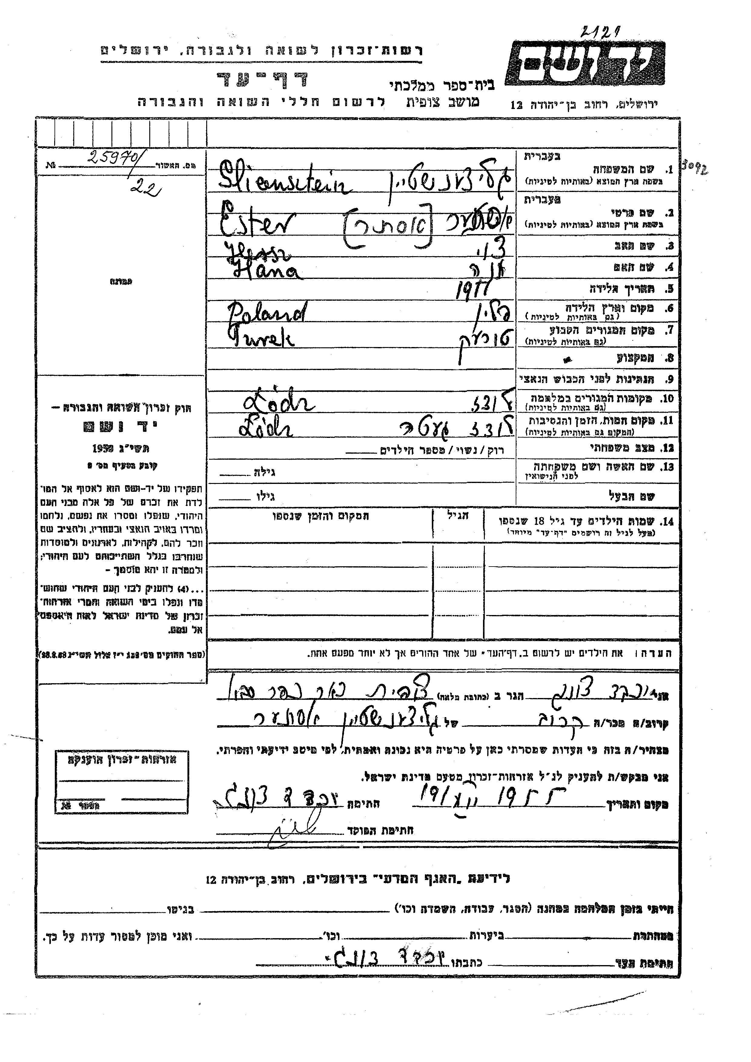 Эстер Глиценштейн, место рождения: Польша. Отец: Гершек Цви, mать:Хана. Место жительства до войны: Турек, Польша. Место во время войны: Лодзь, Польша.