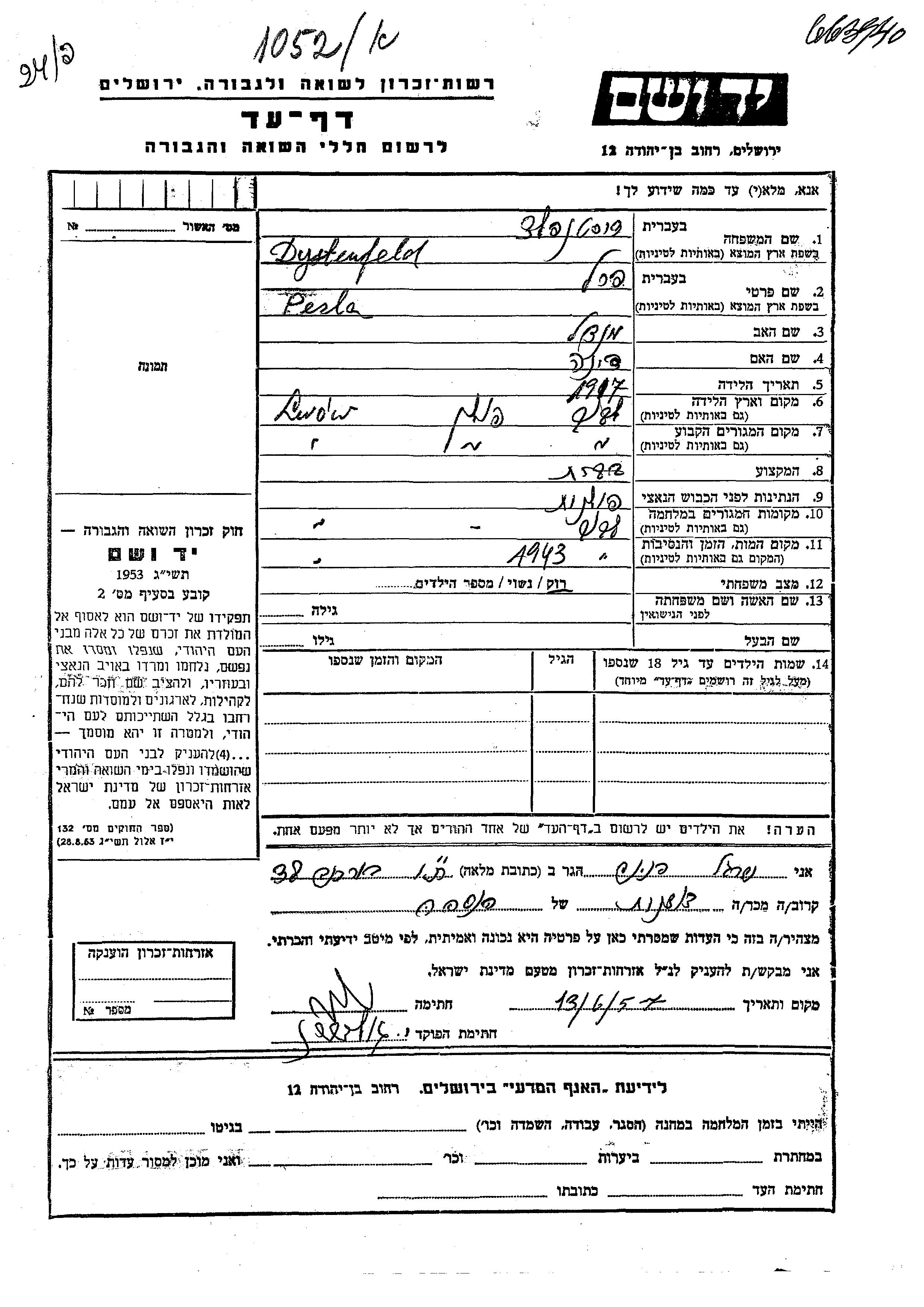 Перла Дистенфельд, место рождения: Львов, Польша. Отец: Мендель, mать:Дина. Домохозяйка. Холост / не замужем. Место жительства до войны: Львов, Польша. Место во время войны: Львов, Польша.