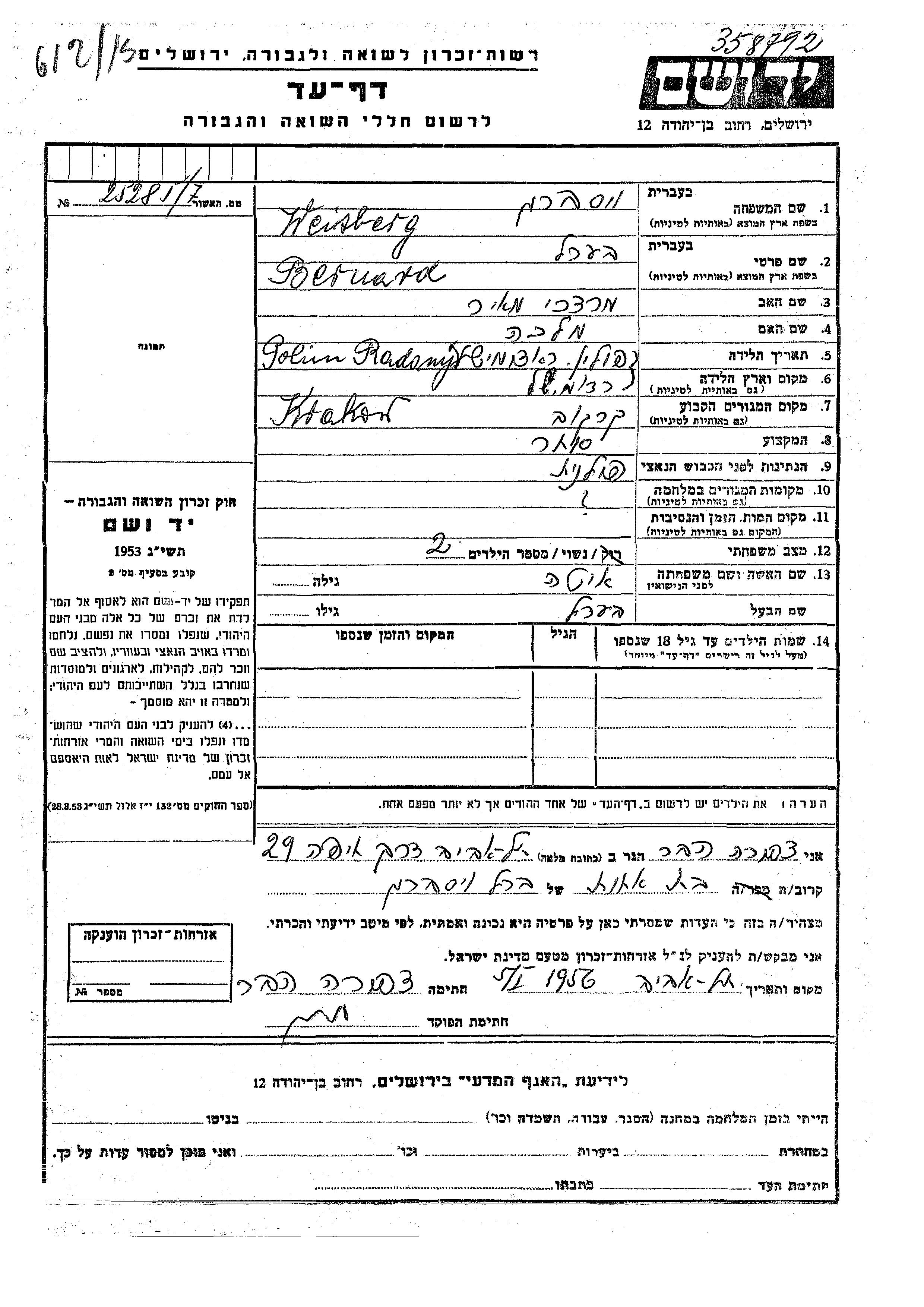 Берл Бернард Вейсберг, место рождения: Радомышль, Польша. Отец: Мордехай Меир, mать:Малка. Торговец / торговка. Женат / замужем. Место жительства до войны: Краков, Польша.