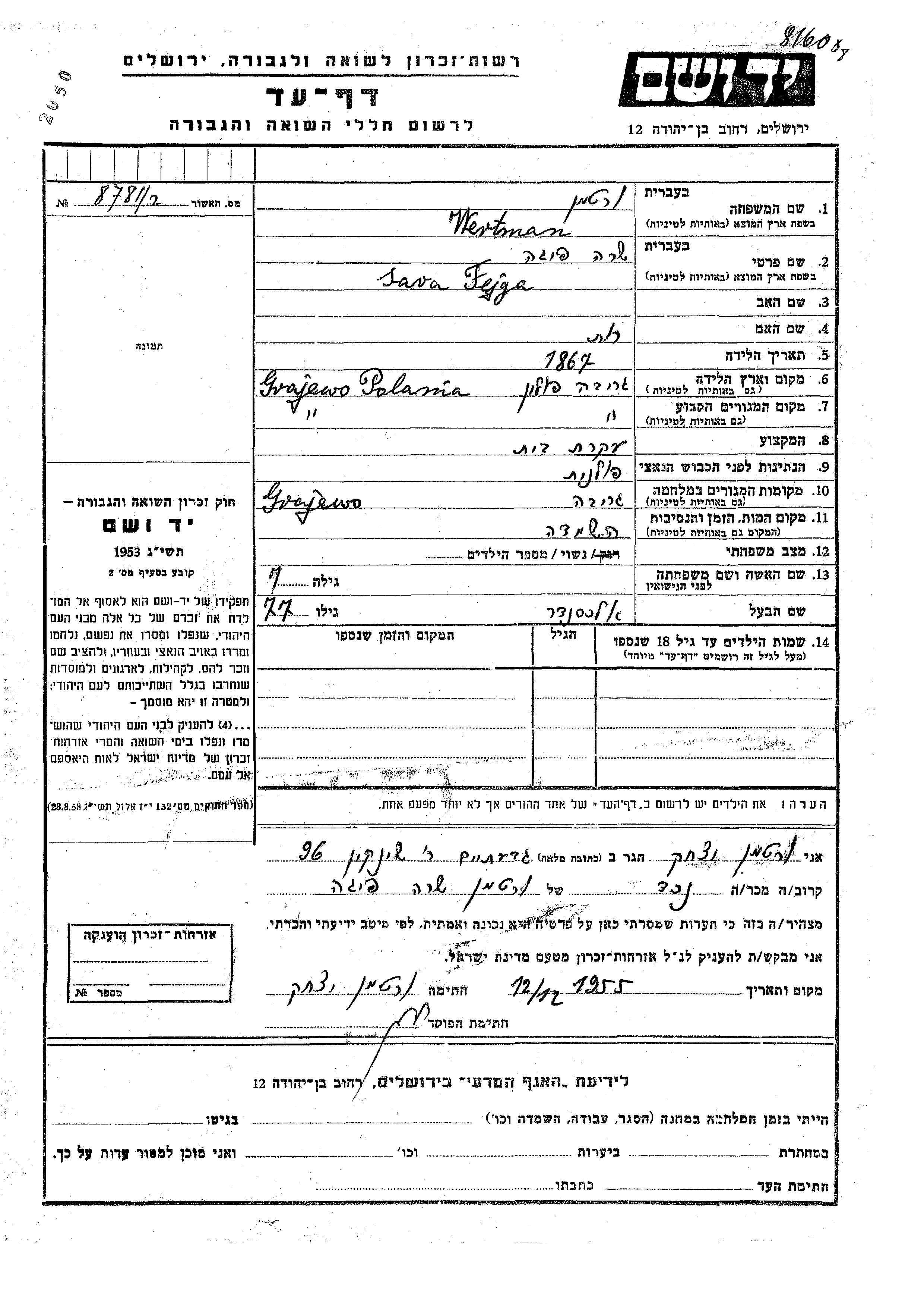 Сара Фейга Вертман Вартман, место рождения: Граево, Польша.Mать:Рут. Домохозяйка. Женат / замужем. Место жительства до войны: Граево, Польша. Место во время войны: Граево, Польша.
