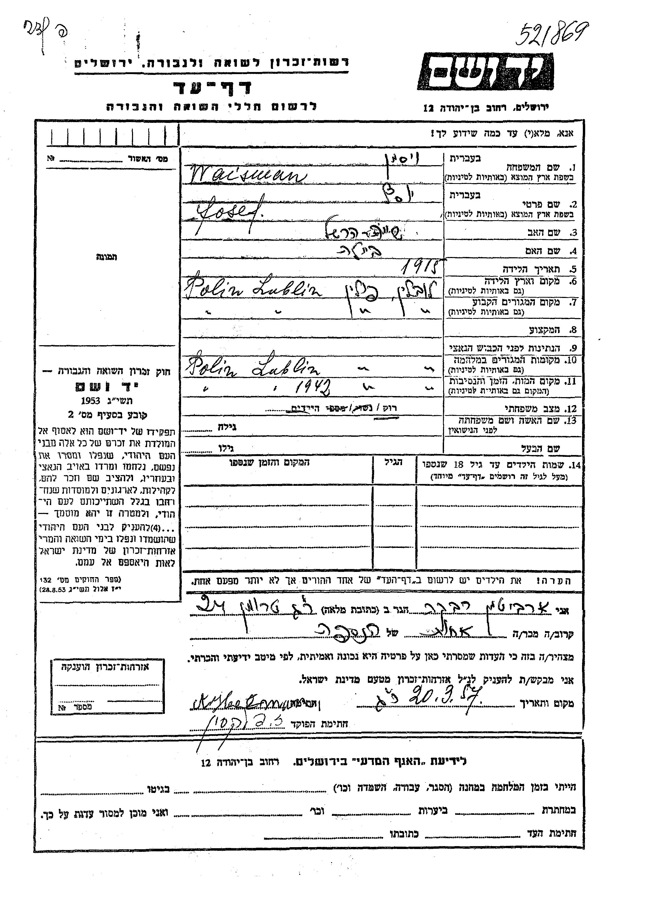 Вайсман Иосеф 1915 Люблин, Польша Лист свидетельских показаний