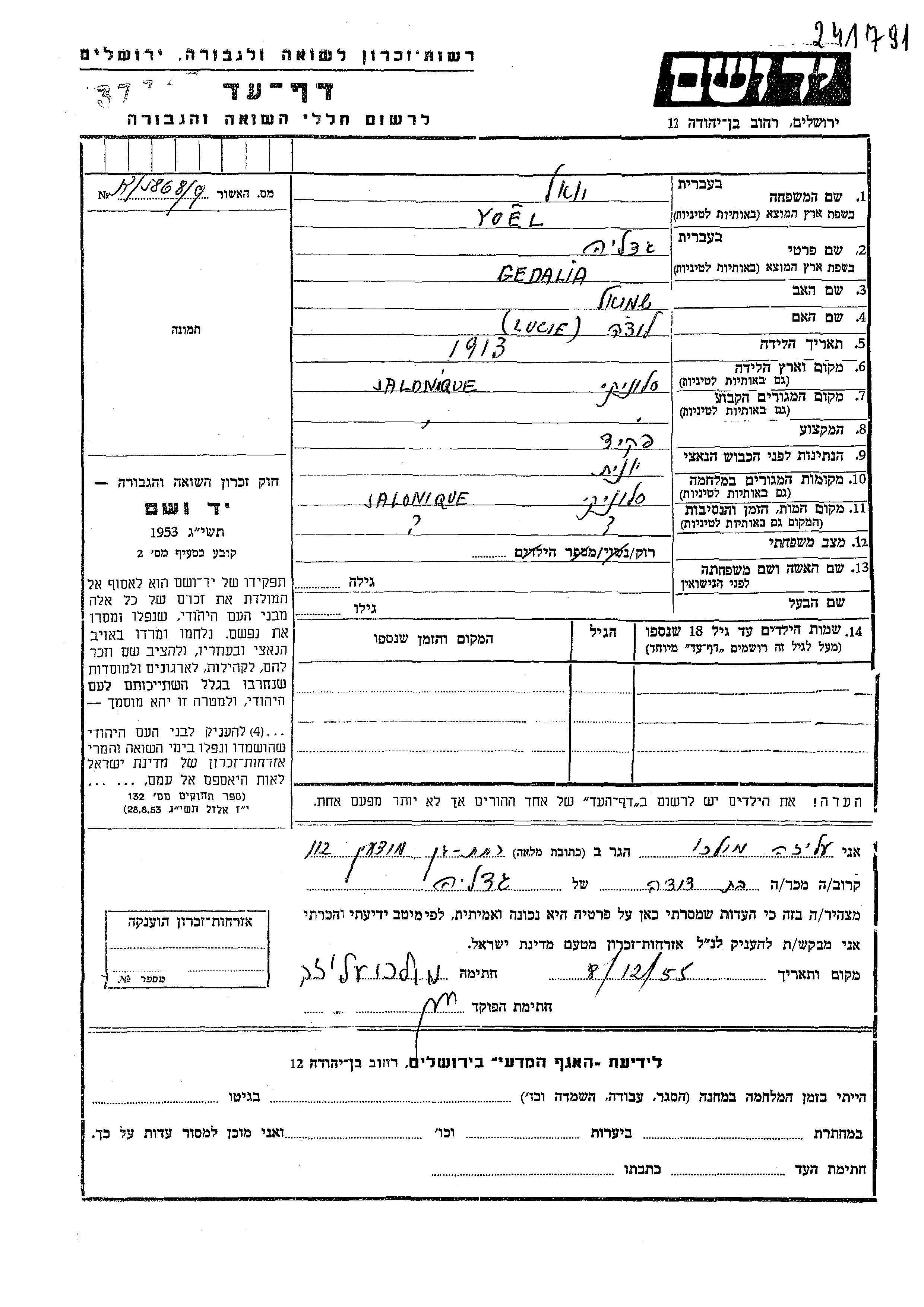 Гедалия Йоэль, место рождения: Салоники, Греция. Отец: Шмуэль, mать:Луци. Клерк. Холост / не замужем. Место жительства до войны: Салоники, Греция. Место во время войны: Салоники, Греция.