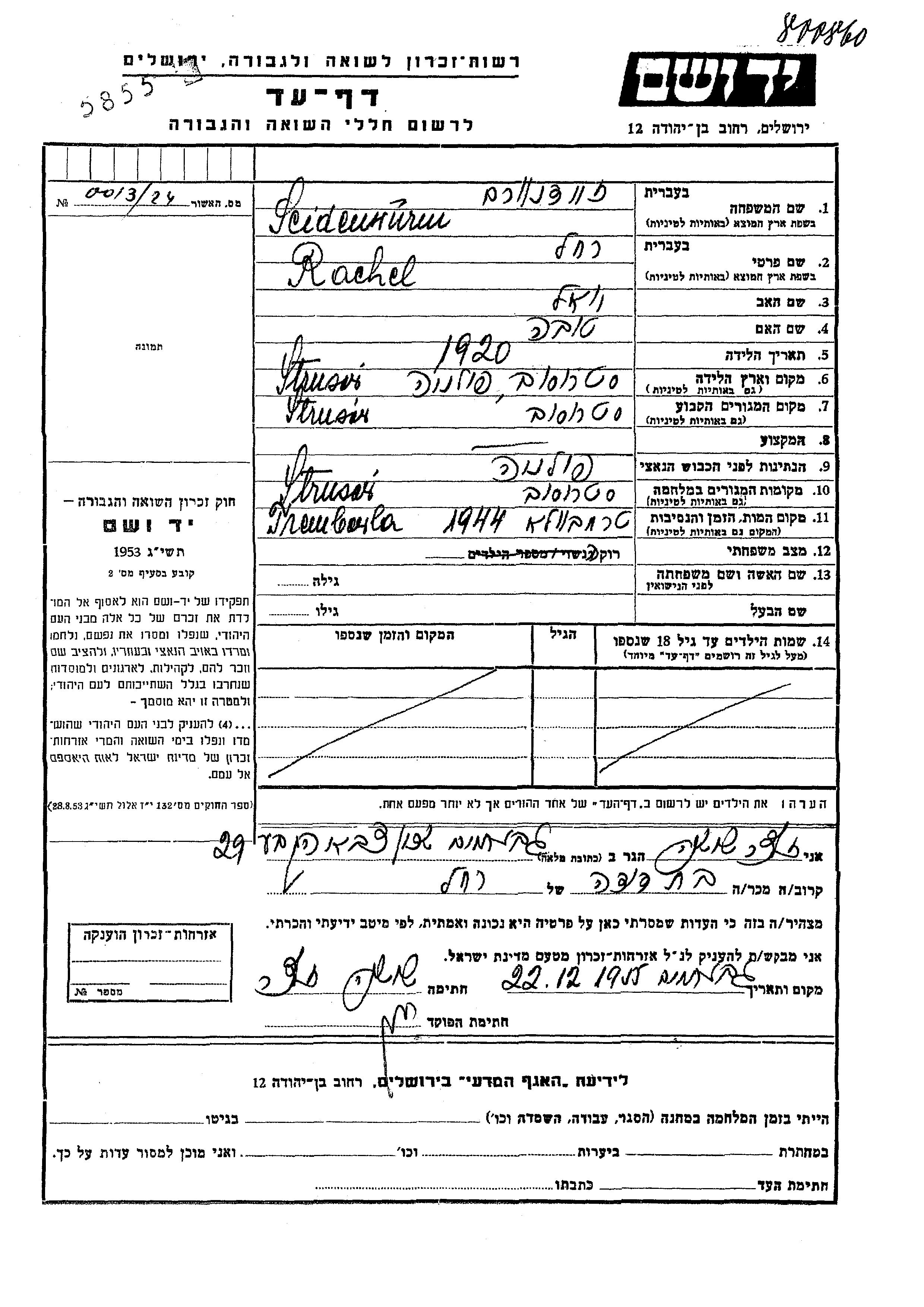 Рахель Зайденвурм, место рождения: Струсов, Польша. Отец: Йоэль, mать:Това. Холост / не замужем. Место жительства до войны: Струсов, Польша. Место во время войны: Струсов, Польша.