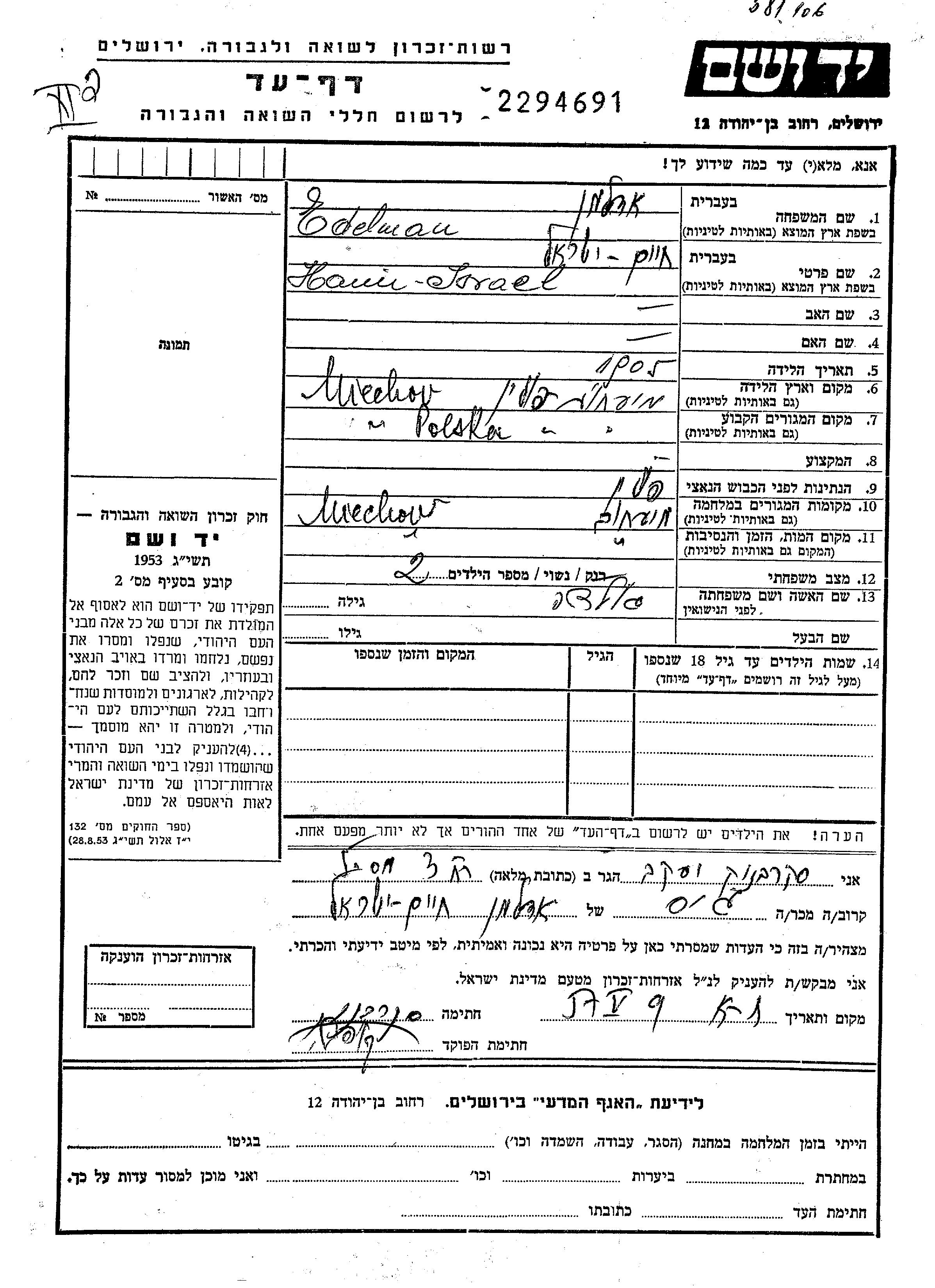 Эдельман Хаим Исраэль 1905 Мехув, Польша Лист свидетельских показаний