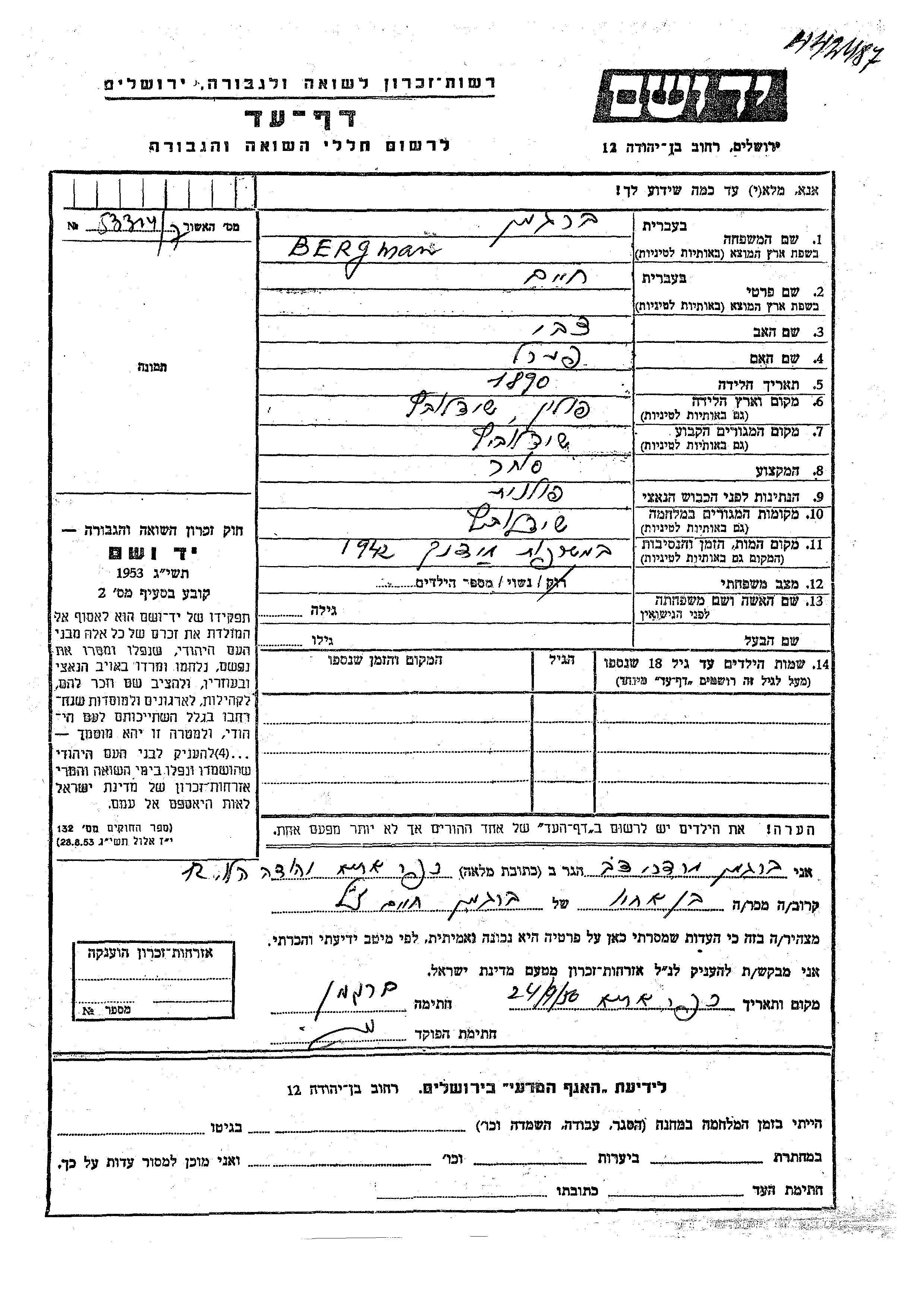 Бергман Хаим 1890 Шидловец, Польша Лист свидетельских показаний
