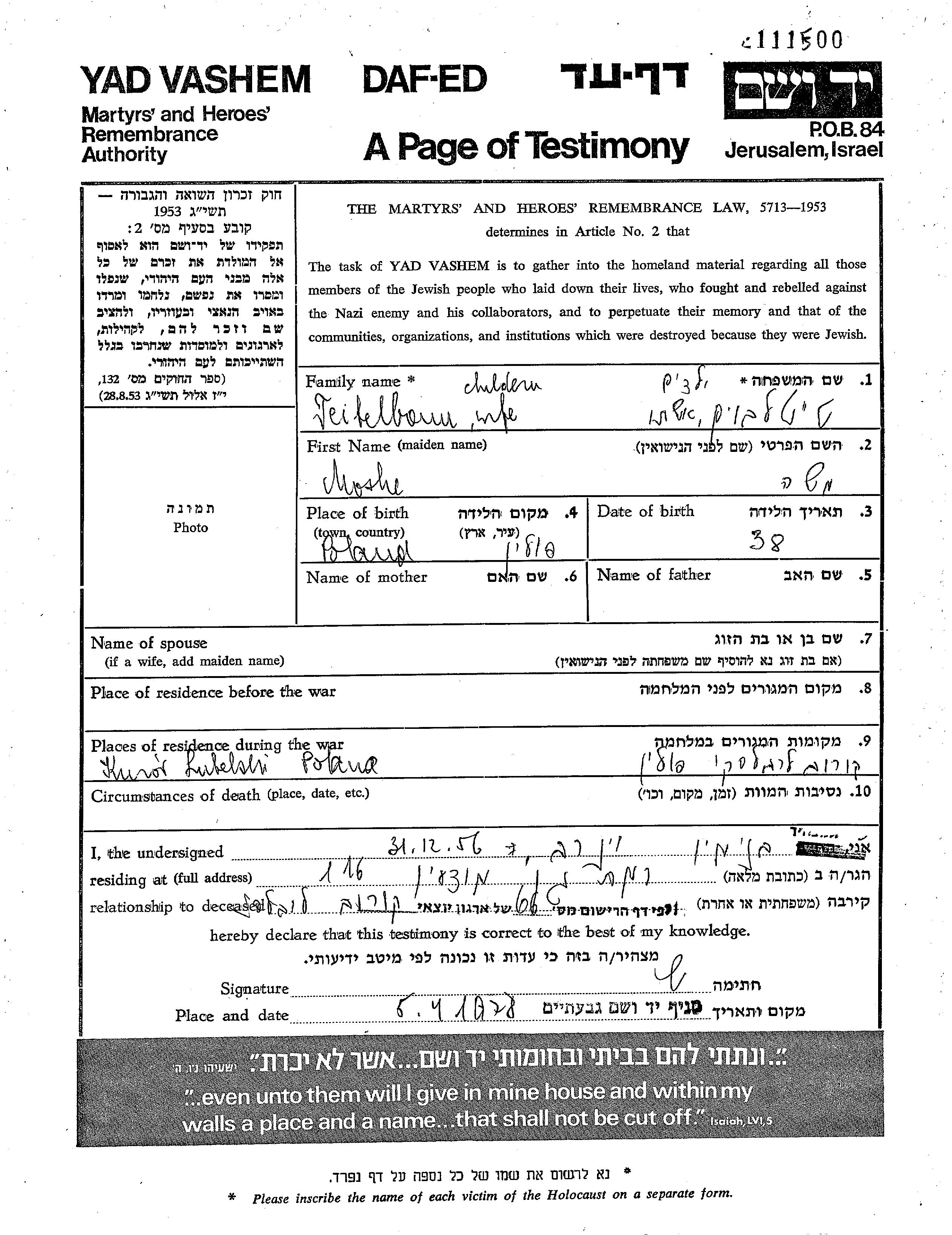 Моше Тейтельбойм, место рождения: Польша. Женат / замужем. Место жительства до войны: Курув, Польша. Место во время войны: Курув, Польша.