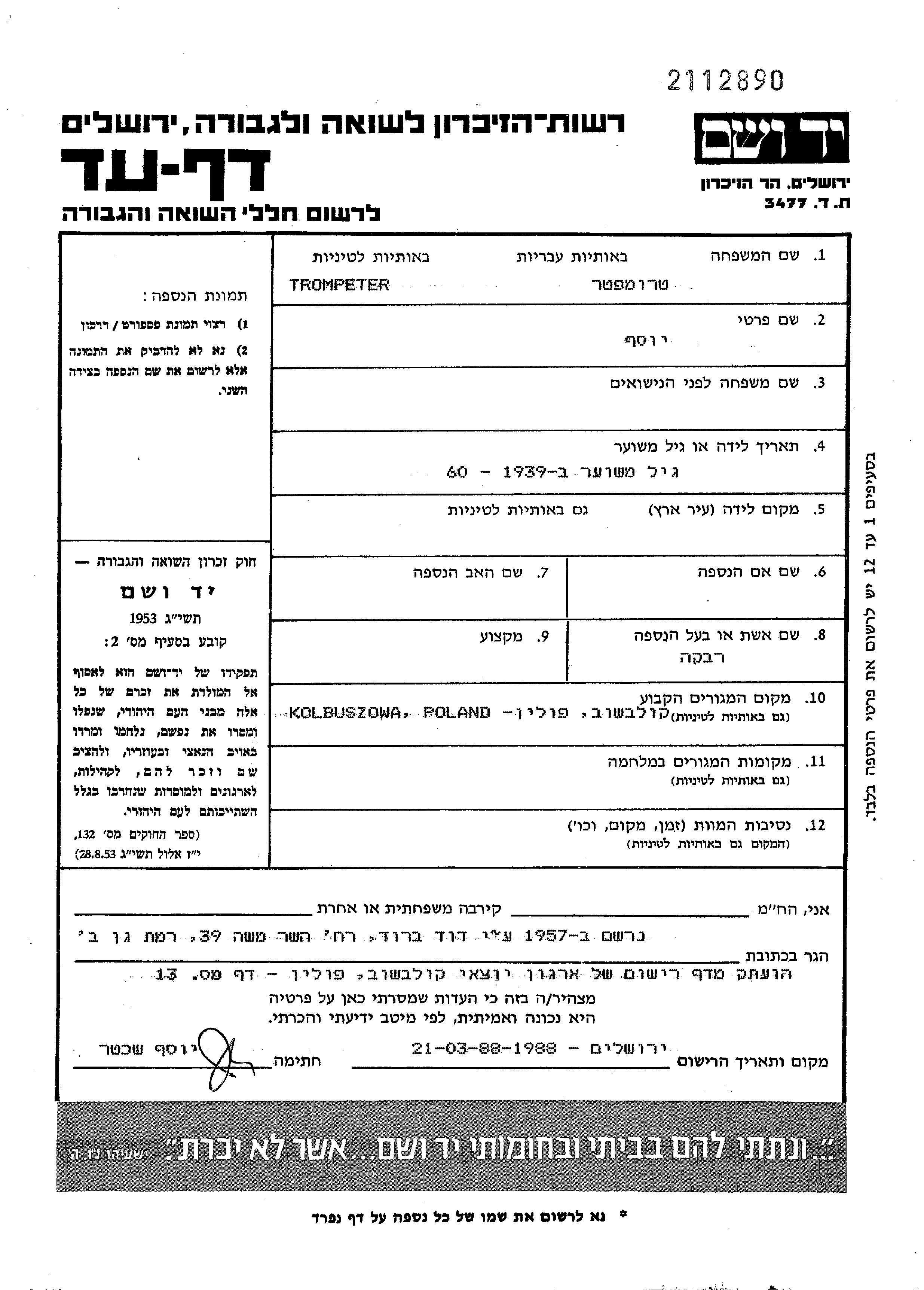 Иосеф Тромпетер. Женат / замужем. Место жительства до войны: Кольбушова, Польша.