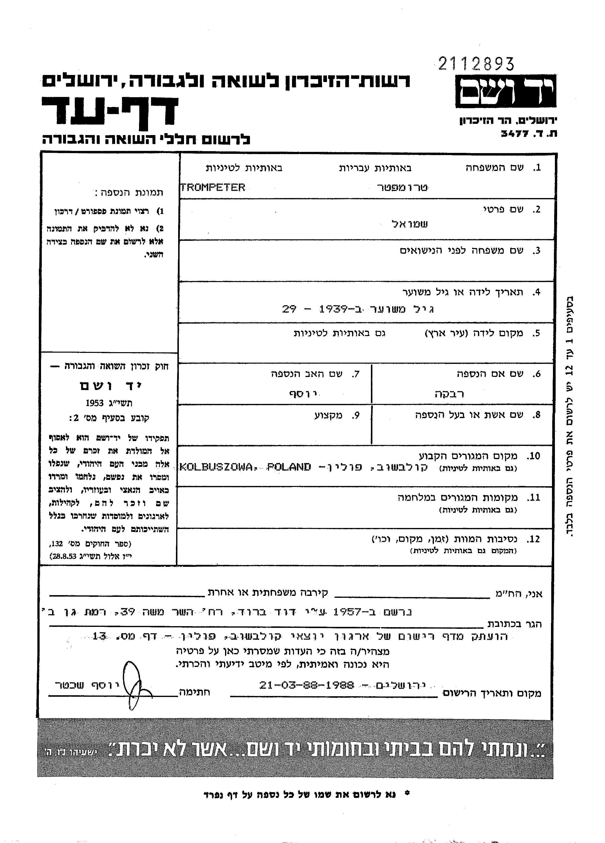 Шмуэль Тромпетер. Отец: Иосеф, mать:Ривка. Место жительства до войны: Кольбушова, Польша.