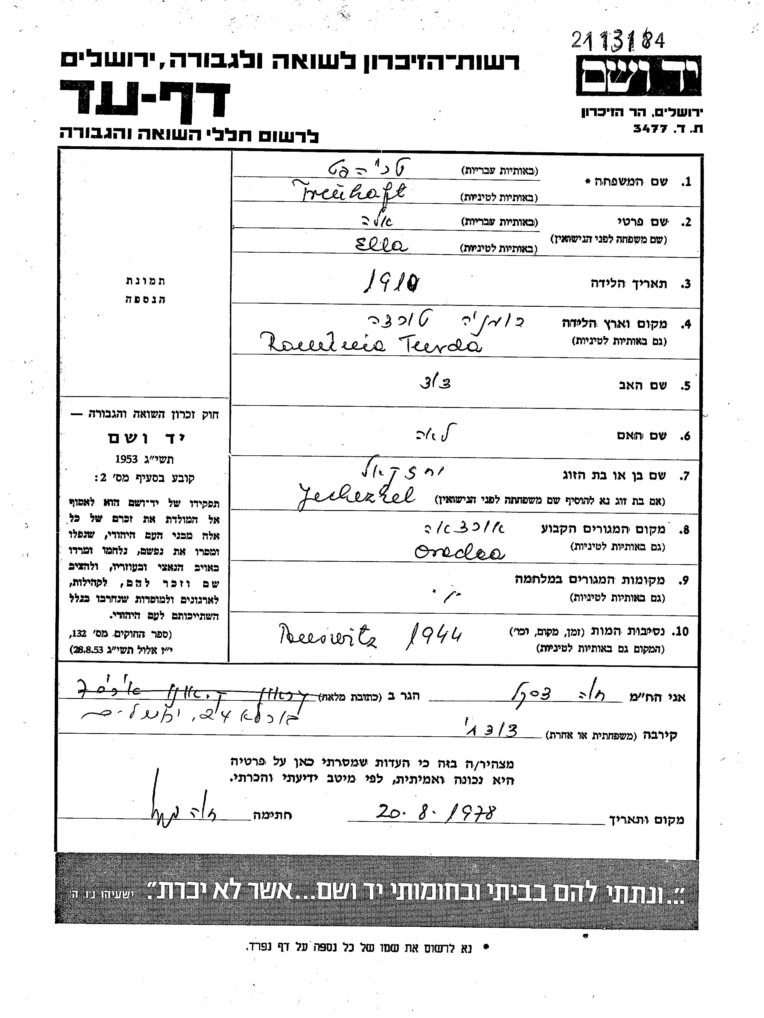Элла Тройхафт, девичья фамилия Леоб Лауб, место рождения: Турда, Румыния. Отец: Давид, mать:Лея. Женат / замужем. Место жительства до войны: Орадя, Румыния. Место во время войны: Орадя, Румыния.