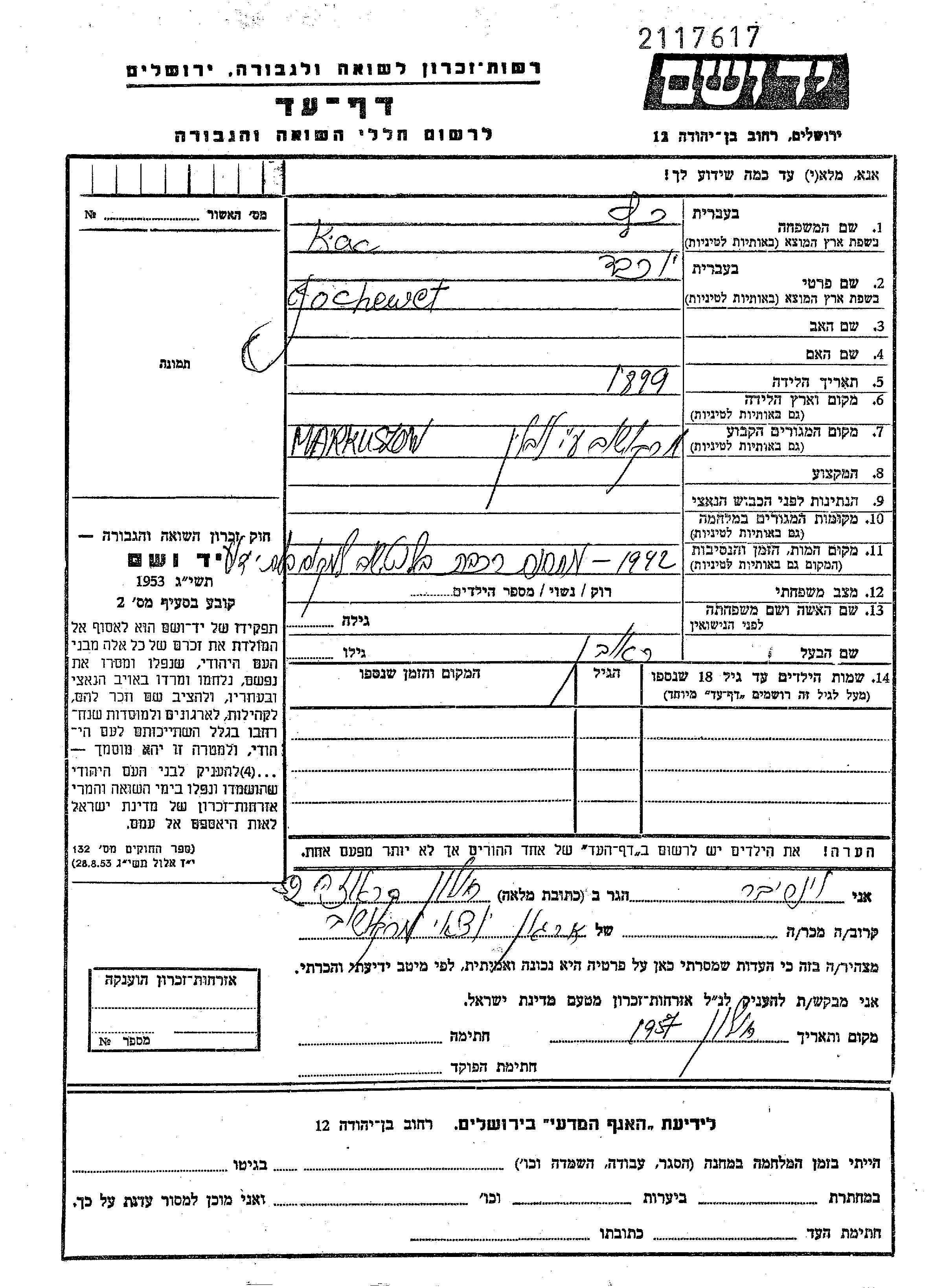 Кац Иохевет 1899 Маркушув, Польша Лист свидетельских показаний