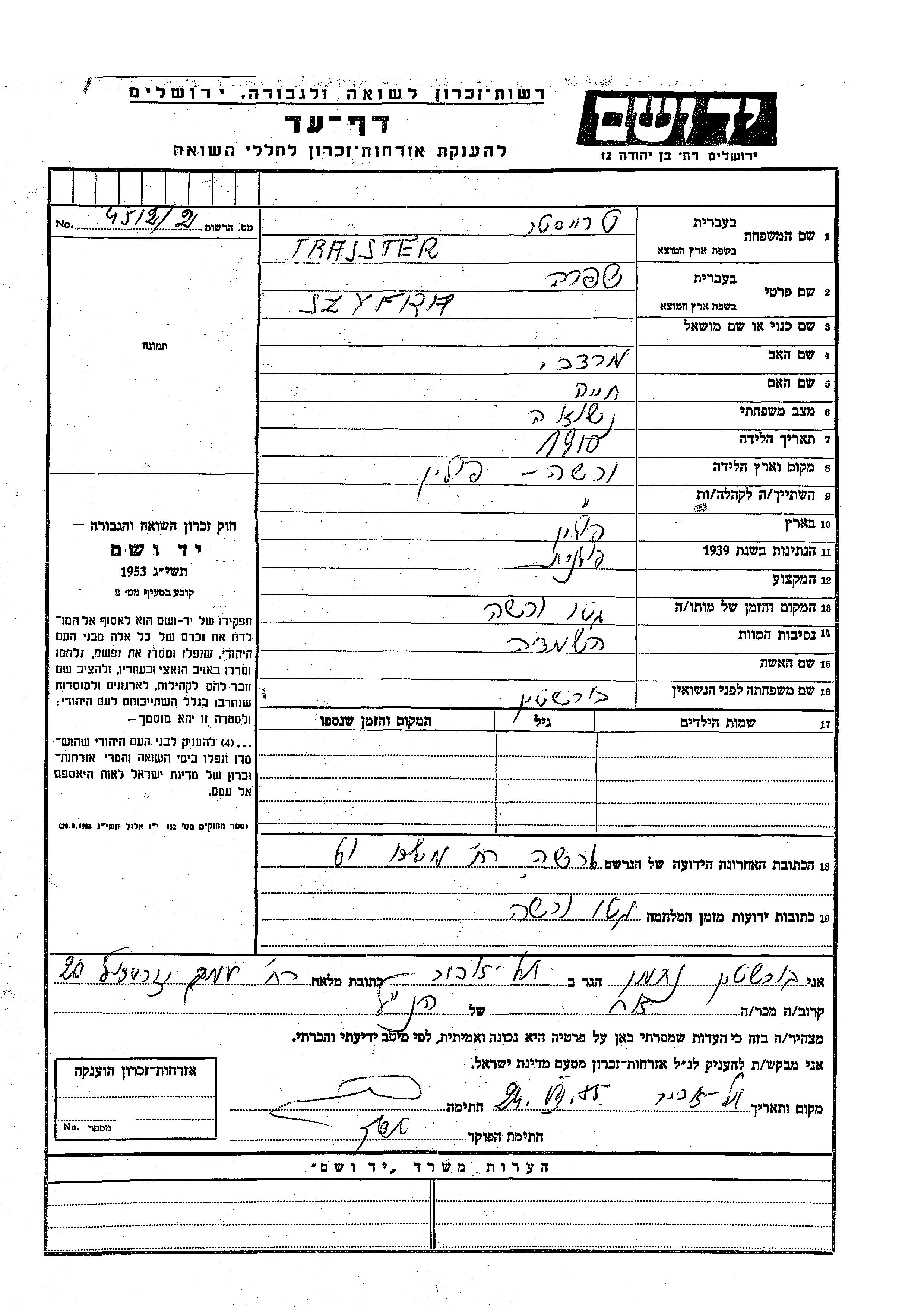 Шифра Трайстер, девичья фамилия Бурштин, место рождения: Варшава, Польша. Отец: Мордехай, mать:Хая. Женат / замужем. Место жительства до войны: Варшава, Польша. Место во время войны: Варшава, Польша.