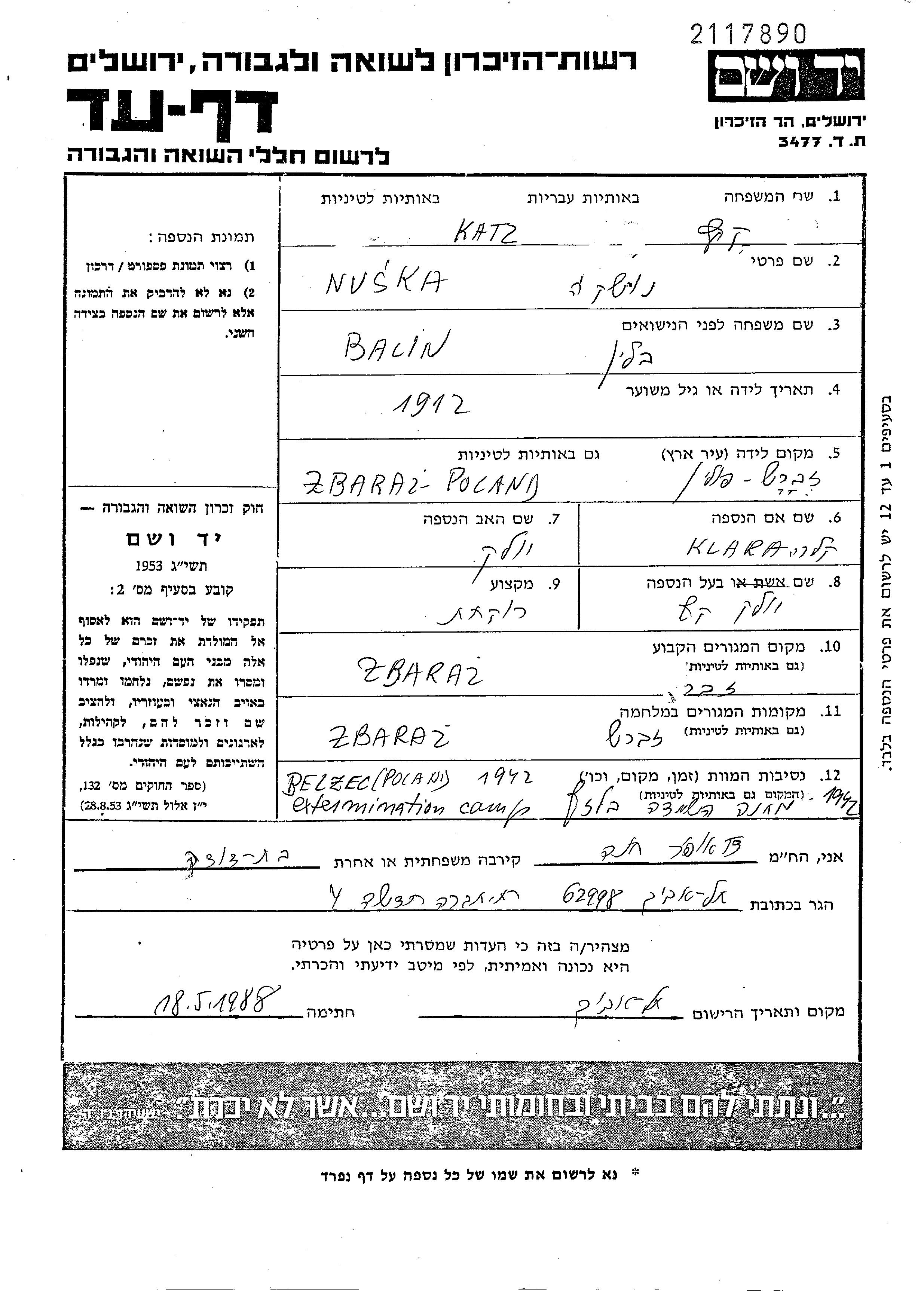 Нуска Нушка Кац, место рождения: Збараж, Польша. Отец: Юлек, mать:Клара. Фармацевт / аптекарь / провизор. Женат / замужем. Место жительства до войны: Збараж, Польша. Место во время войны: Збараж, Польша.