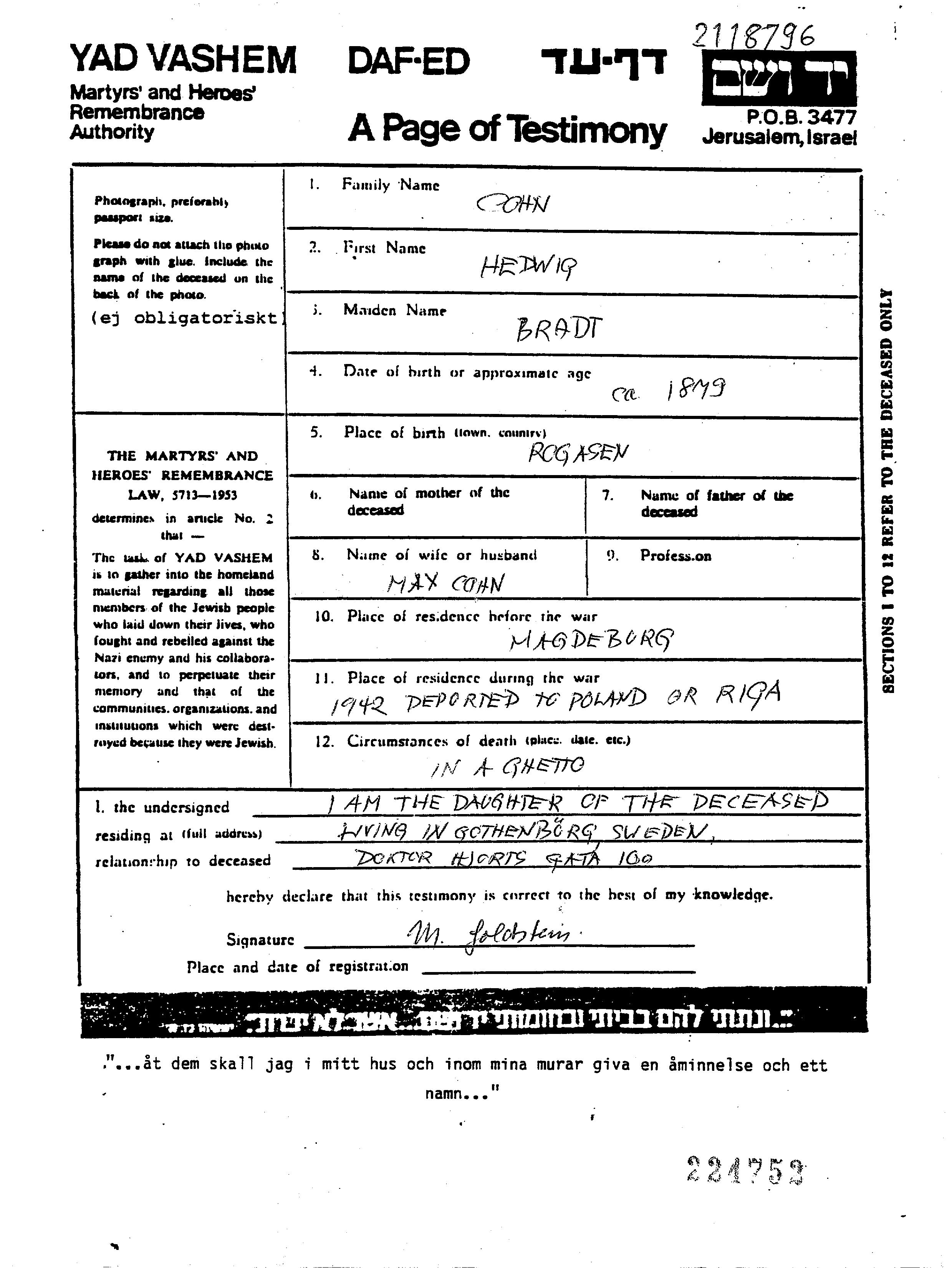 Хедвиг Кон Кун, девичья фамилия Брадт Барт, место рождения: Рогазен, Польша. Женат / замужем. Место жительства до войны: Магдебург, Германия. Место во время войны: Магдебург, Германия.