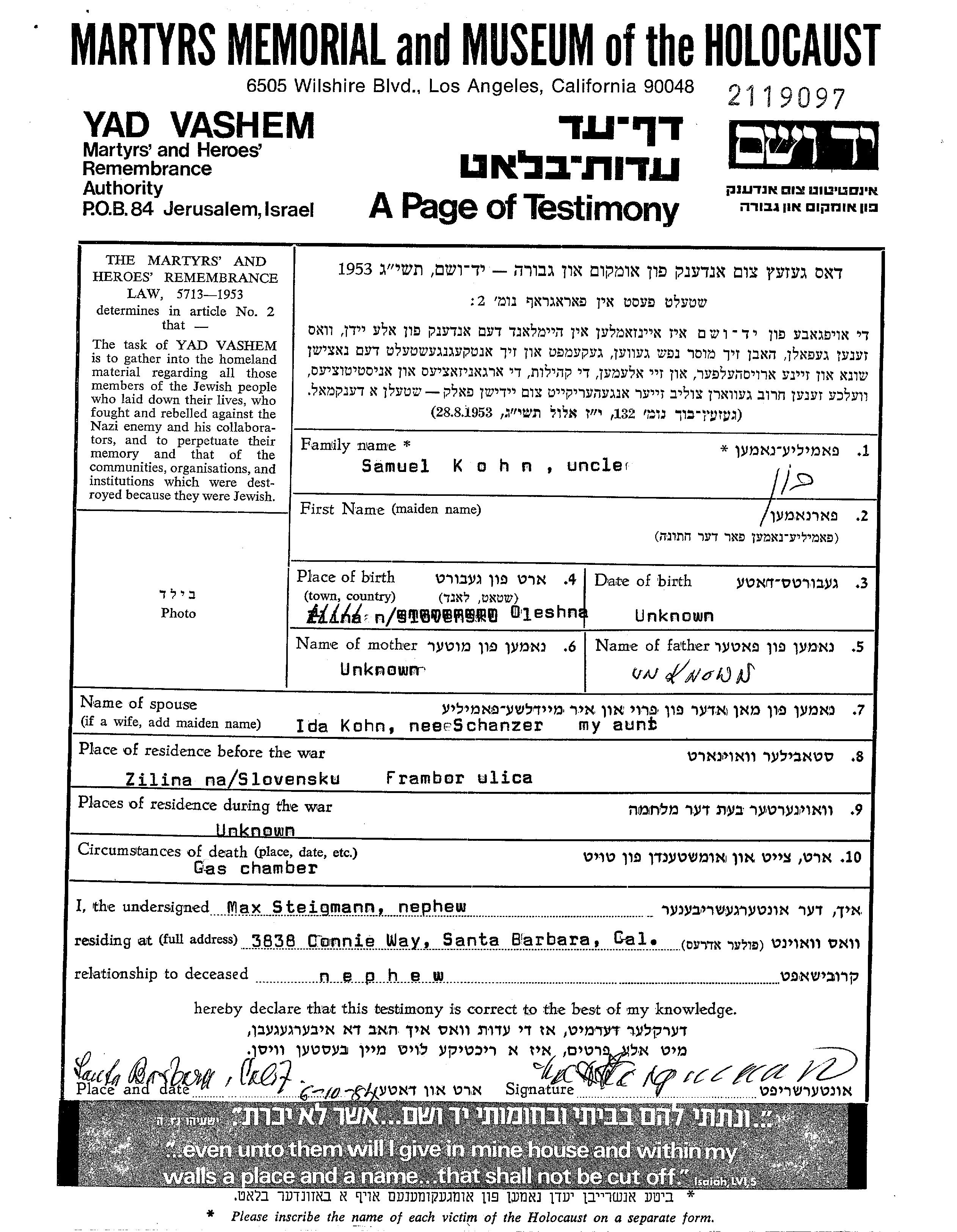Самуэль Кон Кун, место рождения: Олешна, Чехословакия. Женат / замужем. Место жительства до войны: Жилина, Чехословакия. Место во время войны: Чехословакия.