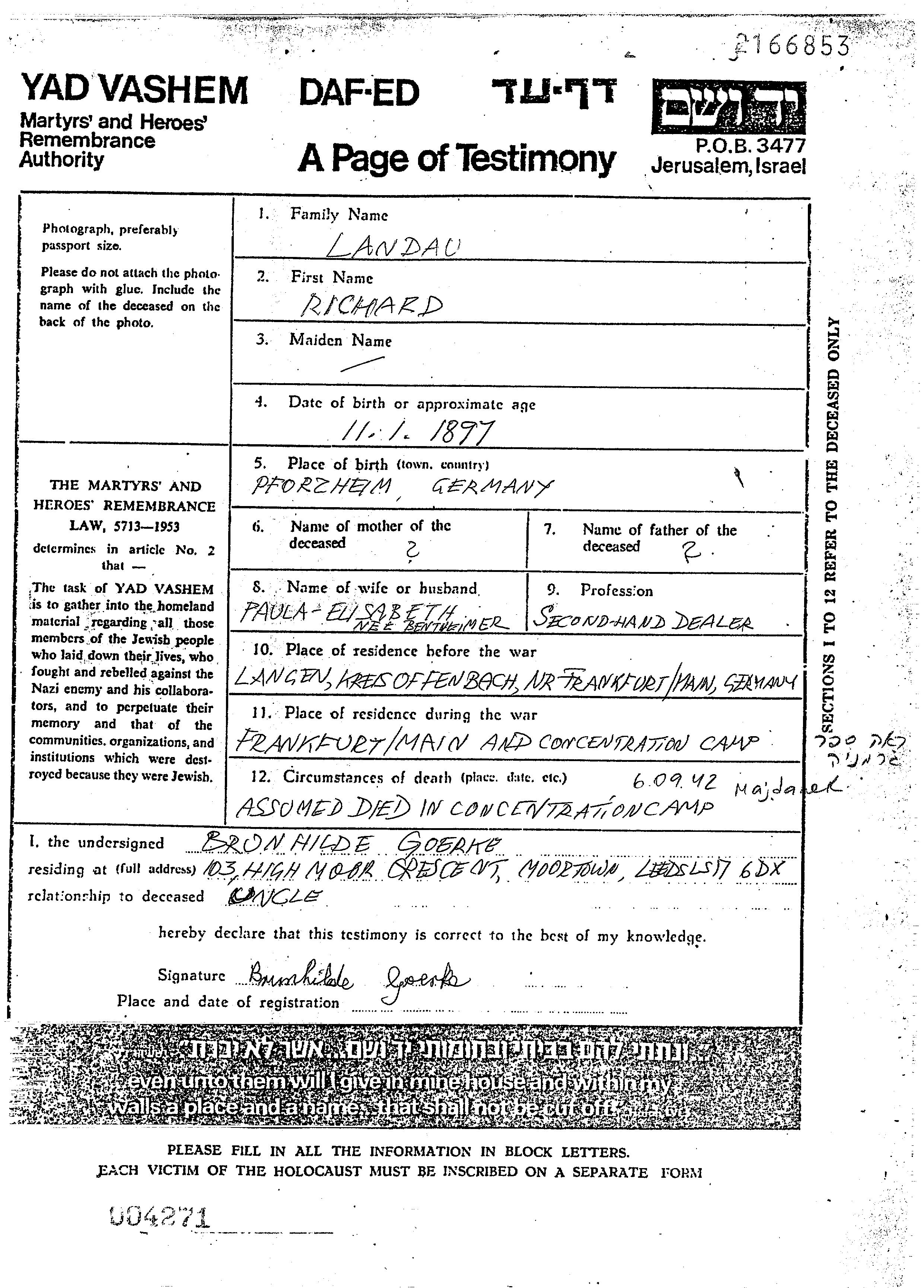 Рихард Ландау, место рождения: Пфорцхейм, Германия. Торговец / торговка. Женат / замужем. Место жительства до войны: Ланген, Германия. Место во время войны: Франкфурт-на-Майне, Германия.