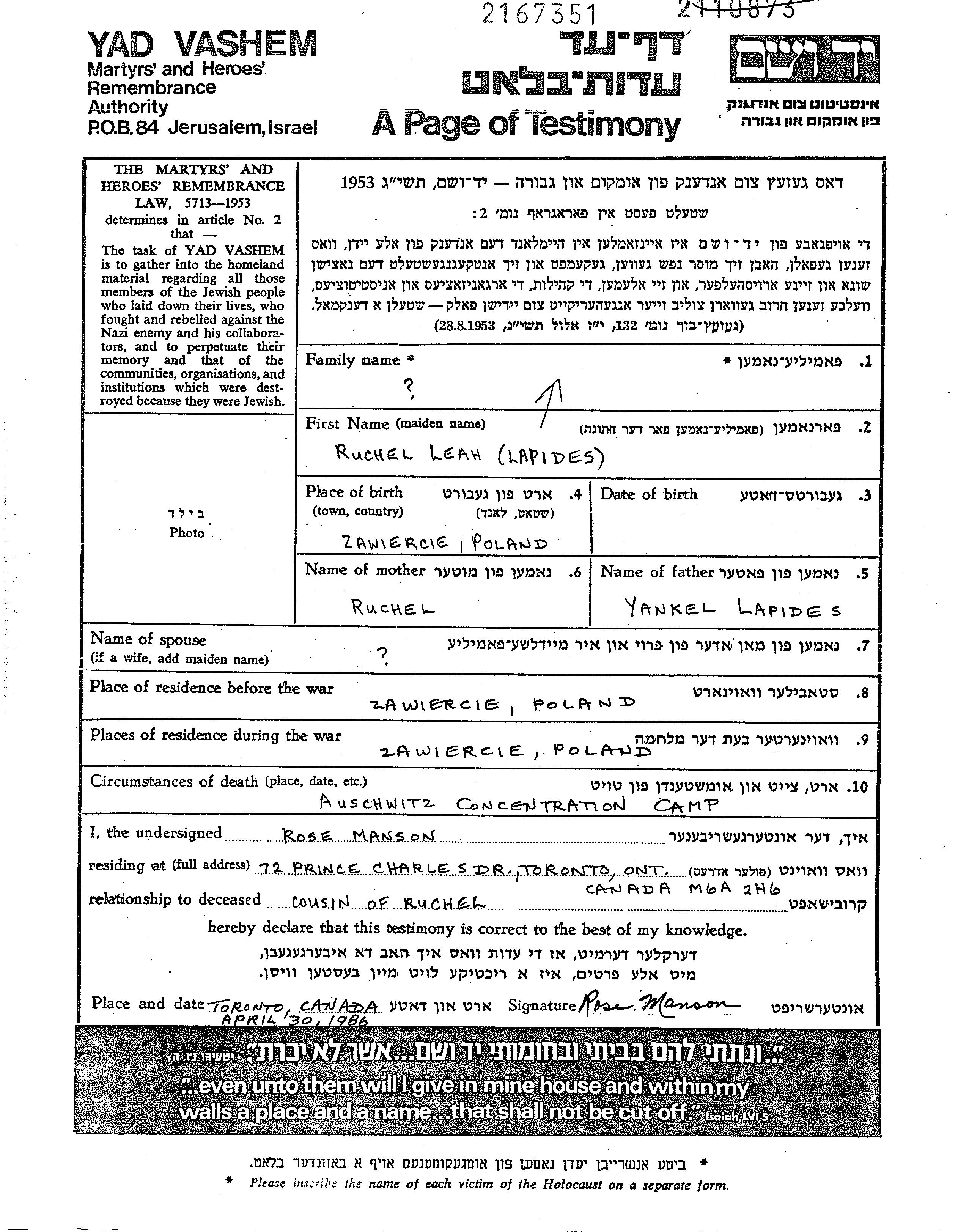 Рухель Лея Фамилия неизвестна, девичья фамилия Лапидес, место рождения: Заверце, Польша. Отец: Янкель, mать:Рухель. Место жительства до войны: Заверце, Польша. Место во время войны: Заверце, Польша.