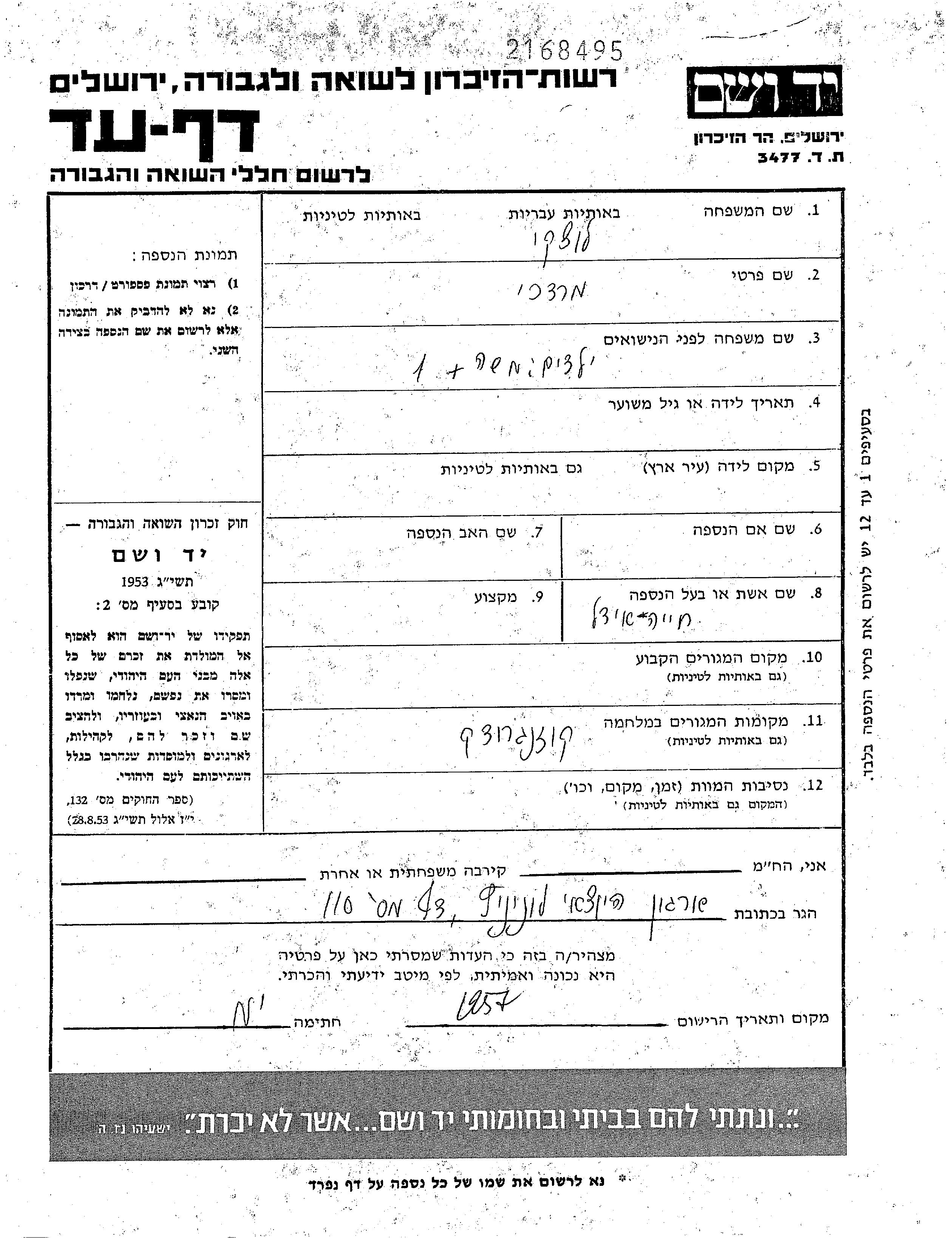 Мордехай Луцки. Женат / замужем. Место жительства до войны: Кожангрудек, Польша. Место во время войны: Кожангрудек, Польша.