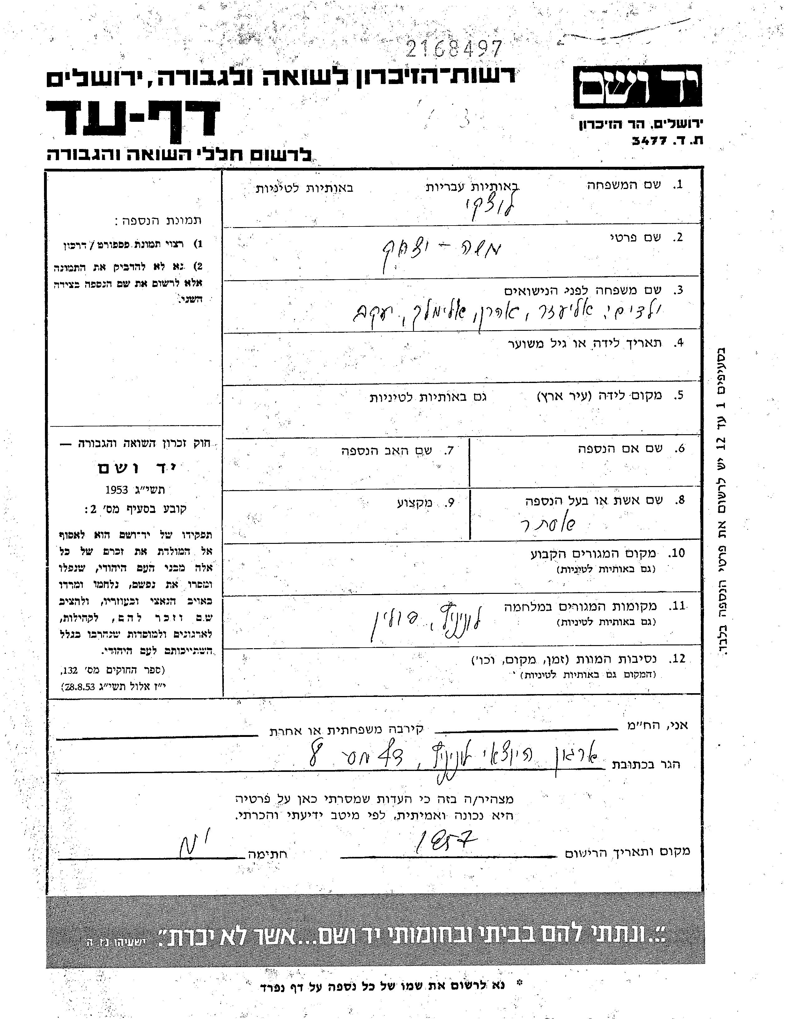 Ицхак Моше Луцки. Женат / замужем. Место жительства до войны: Лунинец, Польша. Место во время войны: Лунинец, Польша.