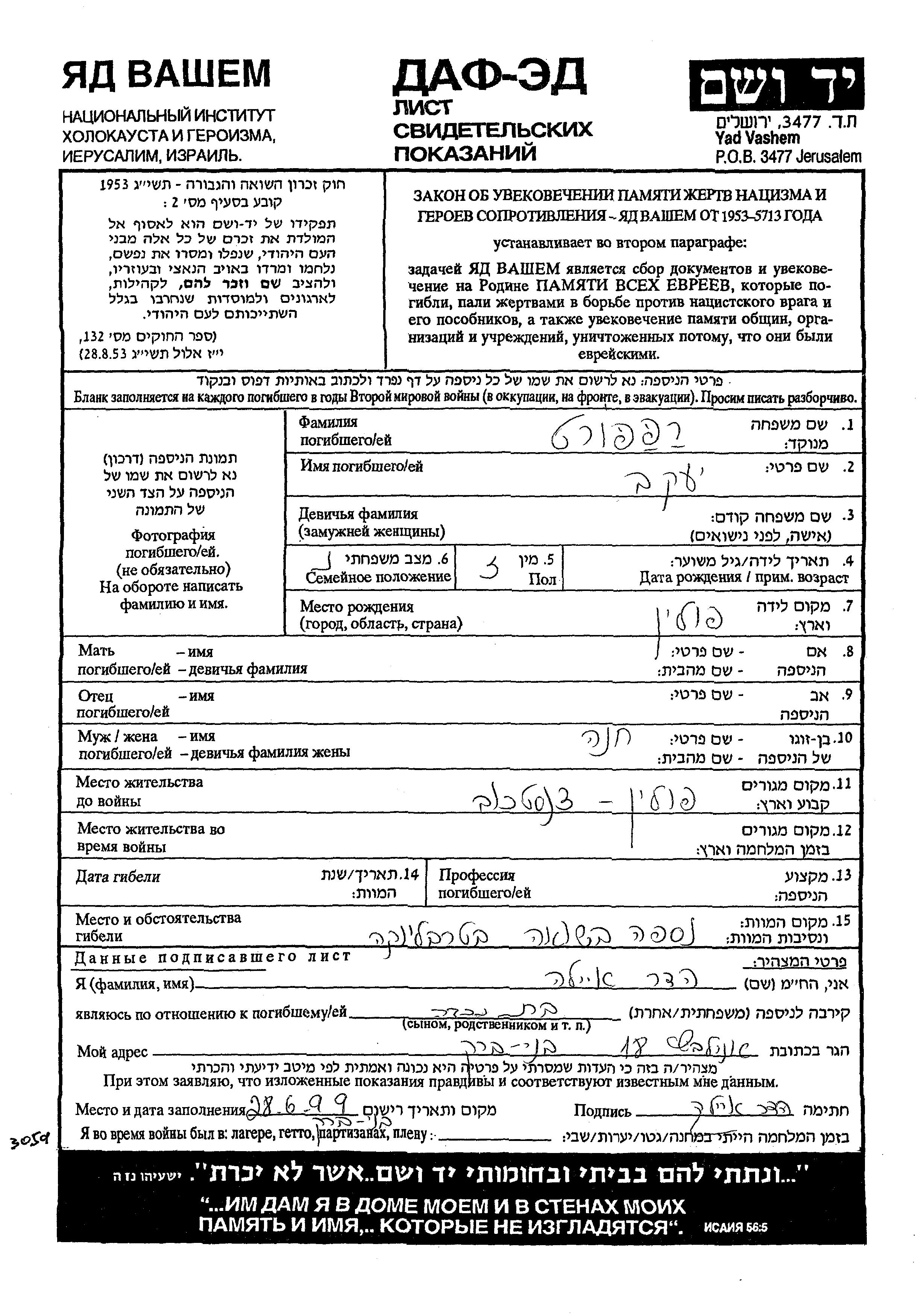 Яд Вашем - Листы свидетельских показаний Мемориального фонда