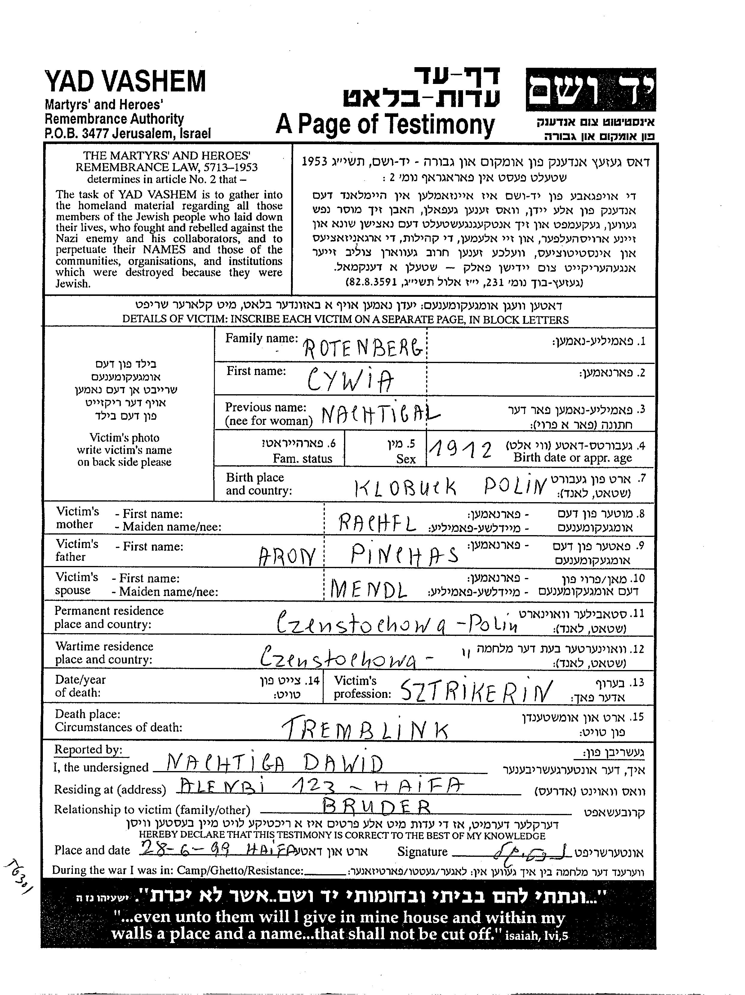 Ротенберг Цивия 1912 Ченстохова, Польша Лист свидетельских показаний