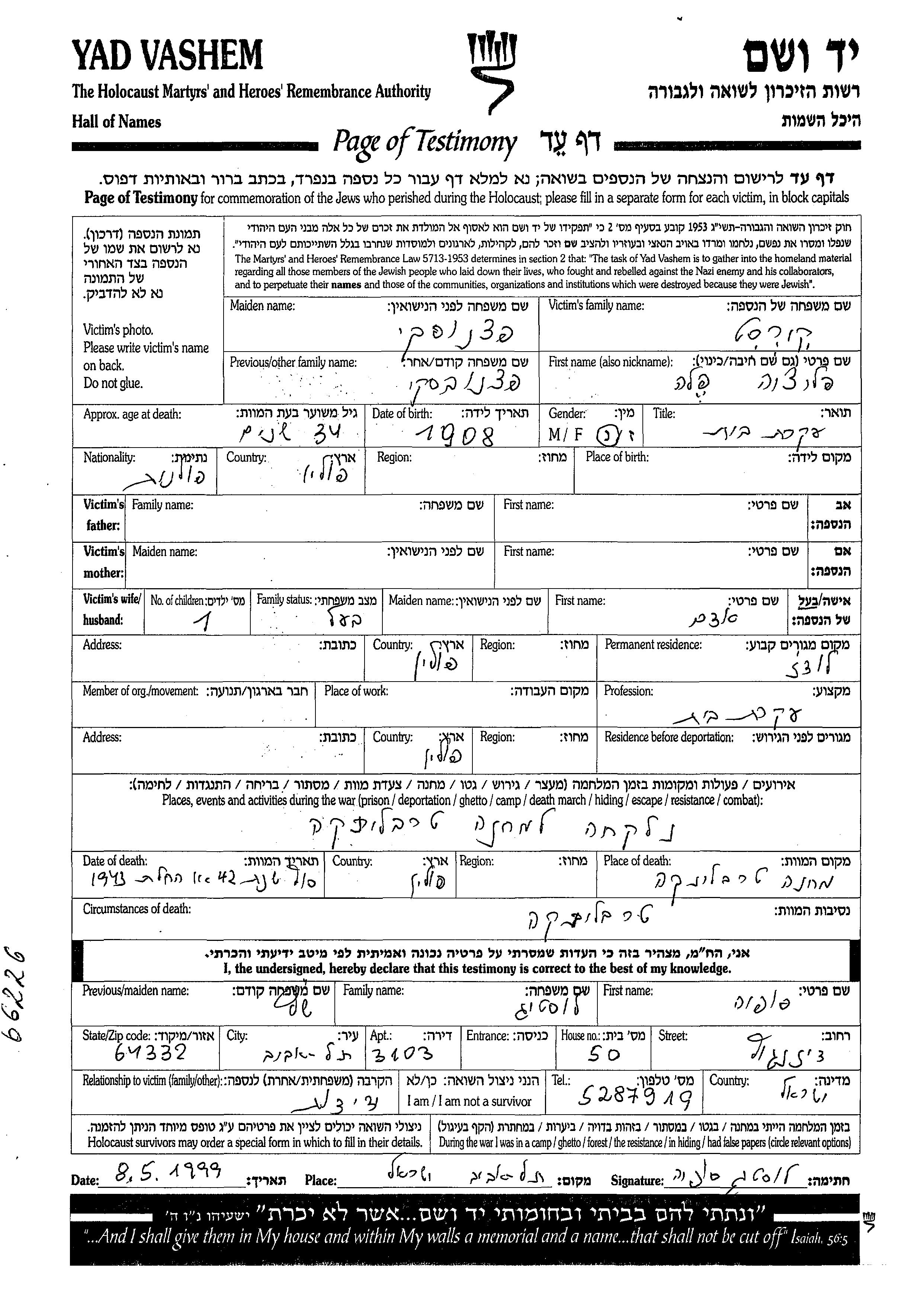 Кирст Фелиция 1908 Лодзь, Польша Лист свидетельских показаний
