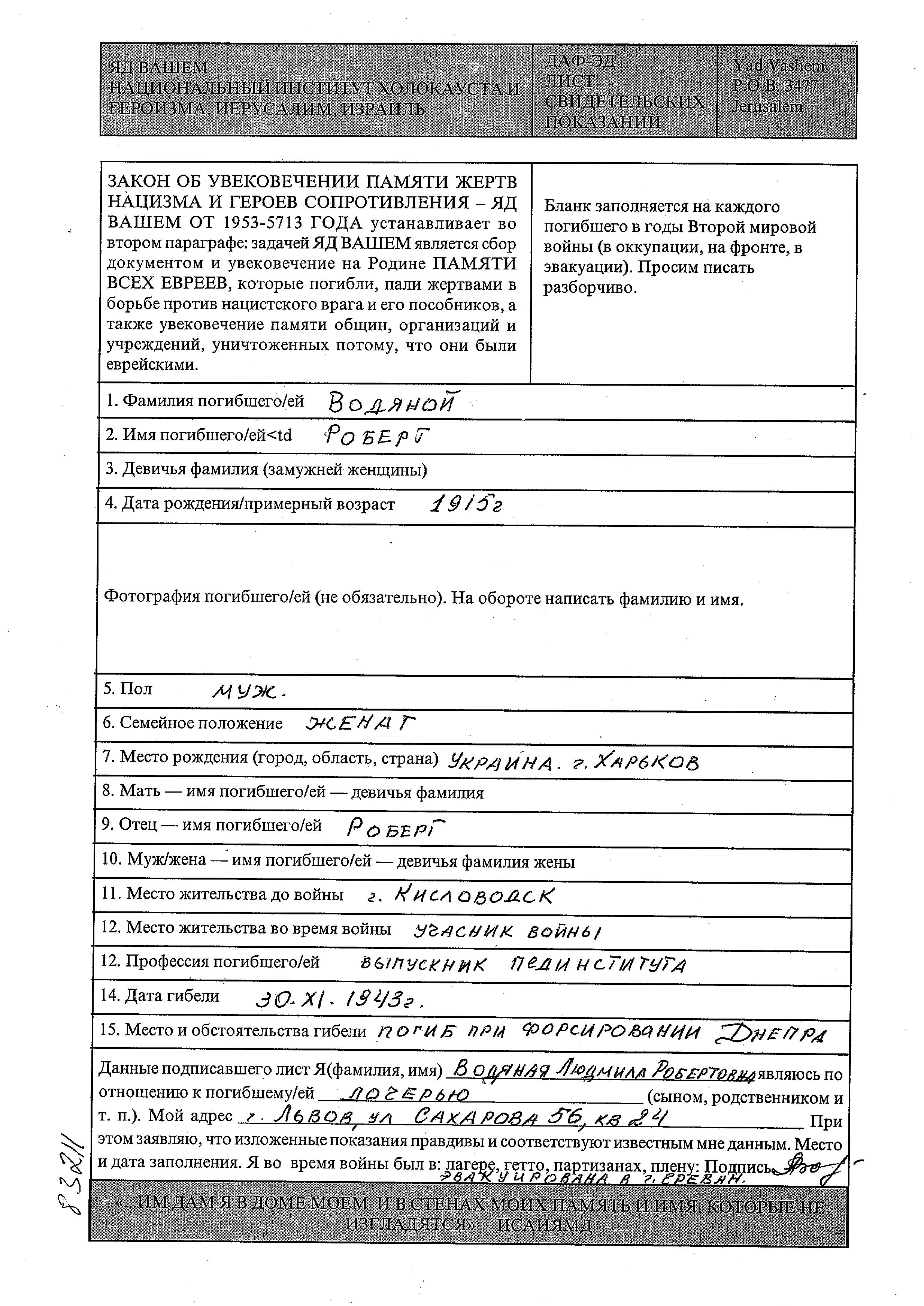 Роберт Водяной, место рождения: Харьков, Украина (СССР). Учитель / учительница. Женат / замужем. Место жительства до войны: Кисловодск, Россия (СССР). Место во время войны: Вооруженные силы Советского Союза. Роберт погиб на военной службе. место смерти: Днепр, МЕСТО УБИЙСТВА в 1943.