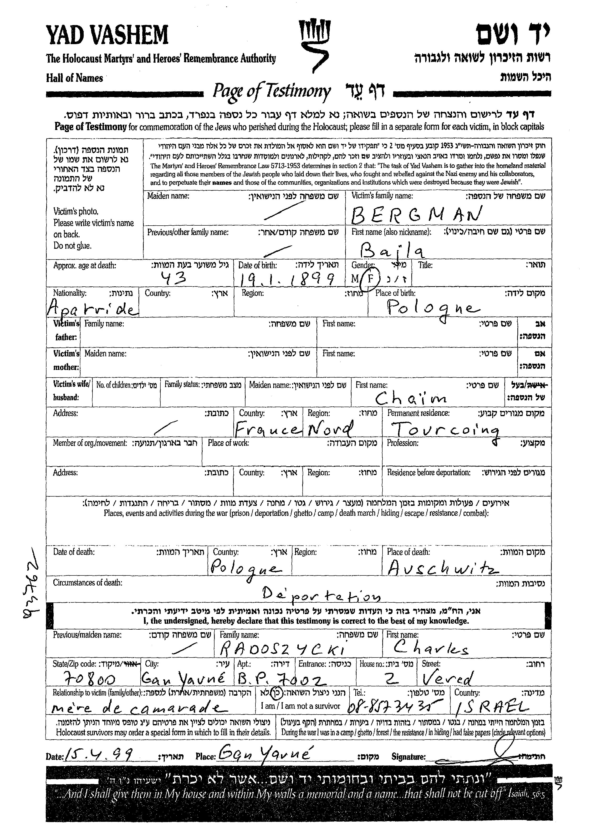 Байла Бергман, место рождения: Польша. Место жительства до войны: Туркуань, Франция. Место во время войны: Туркуань, Франция.