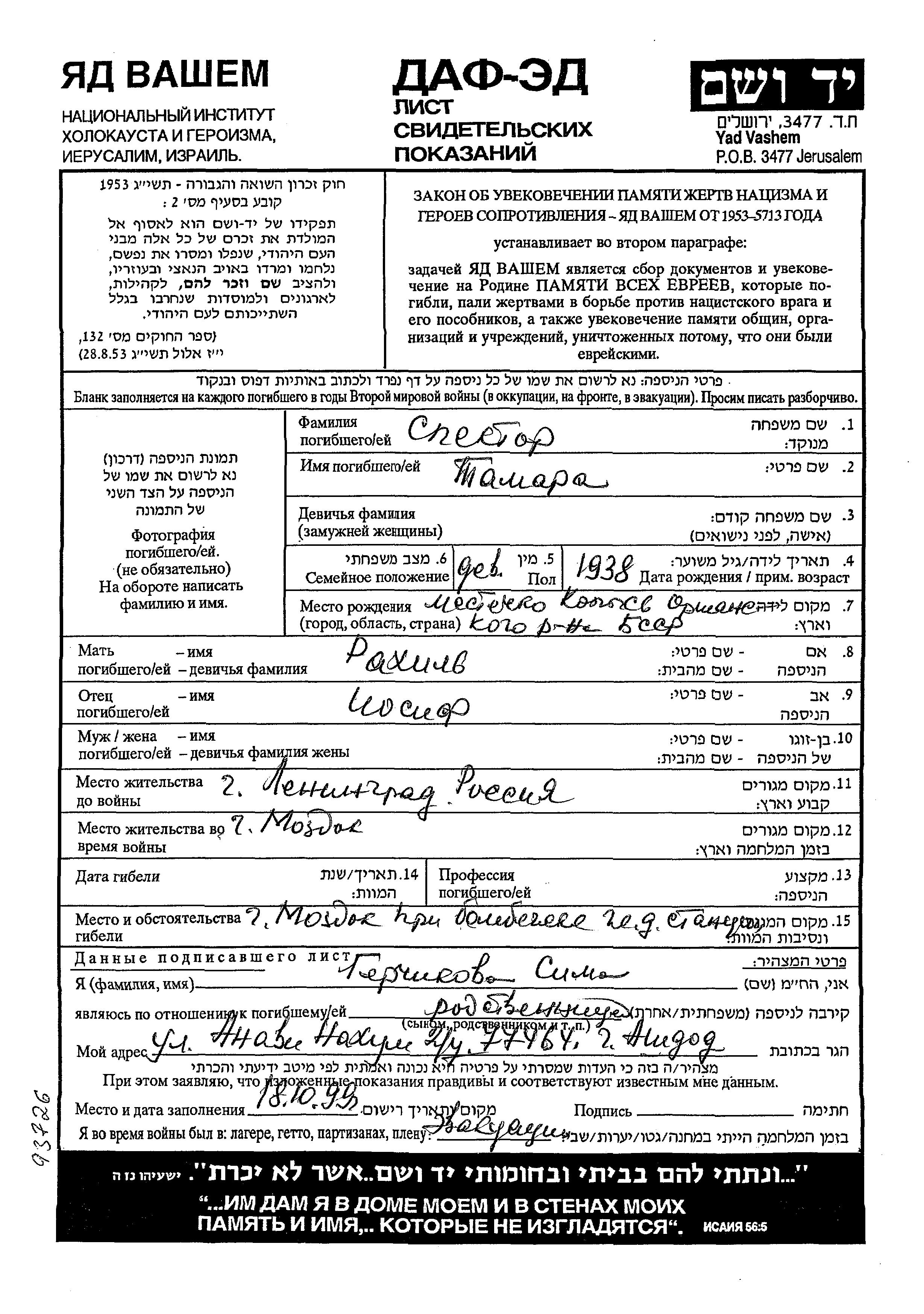 Яд Вашем - Листы свидетельских показаний Мемориального фонда