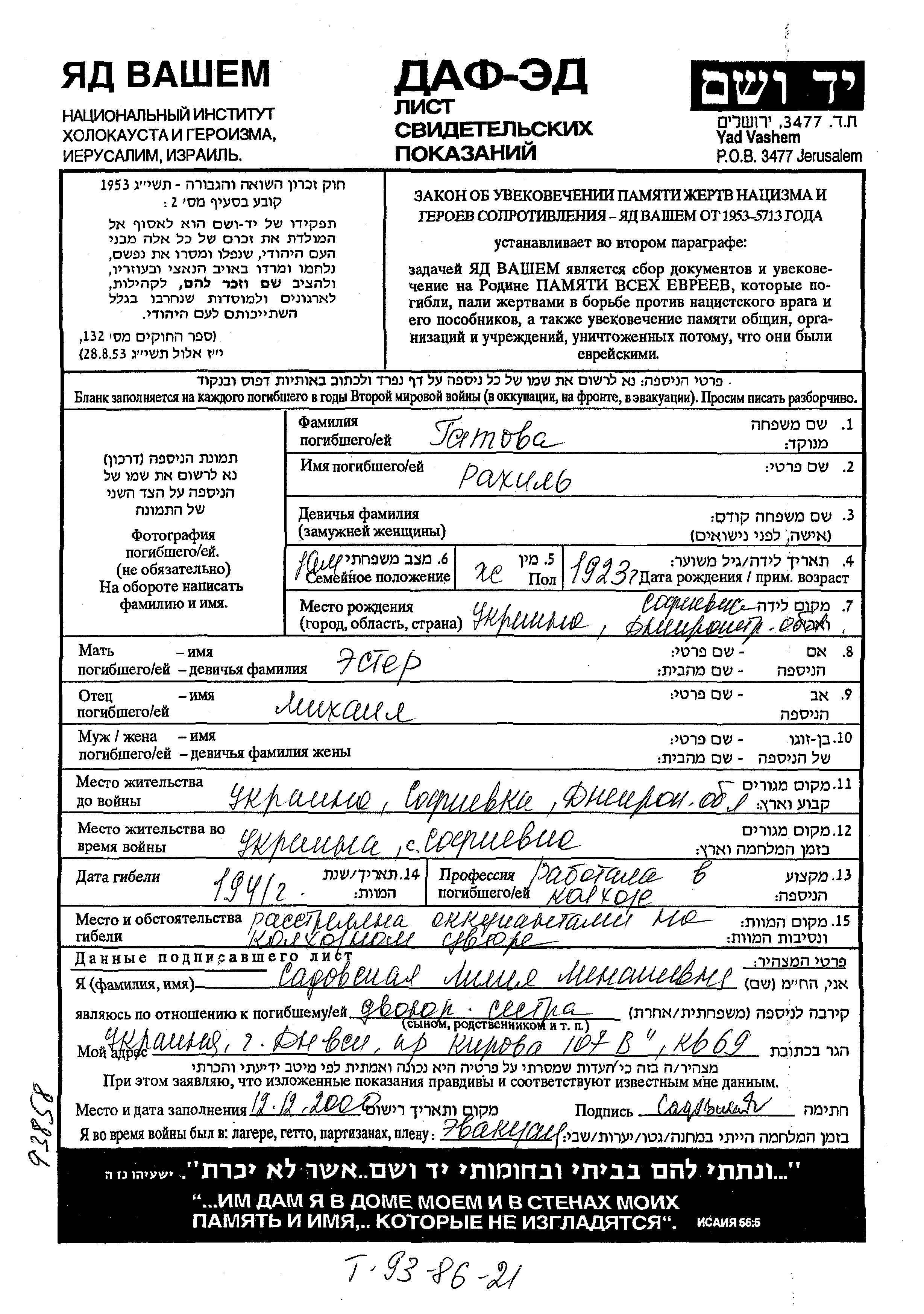 Яд Вашем - Листы свидетельских показаний Мемориального фонда