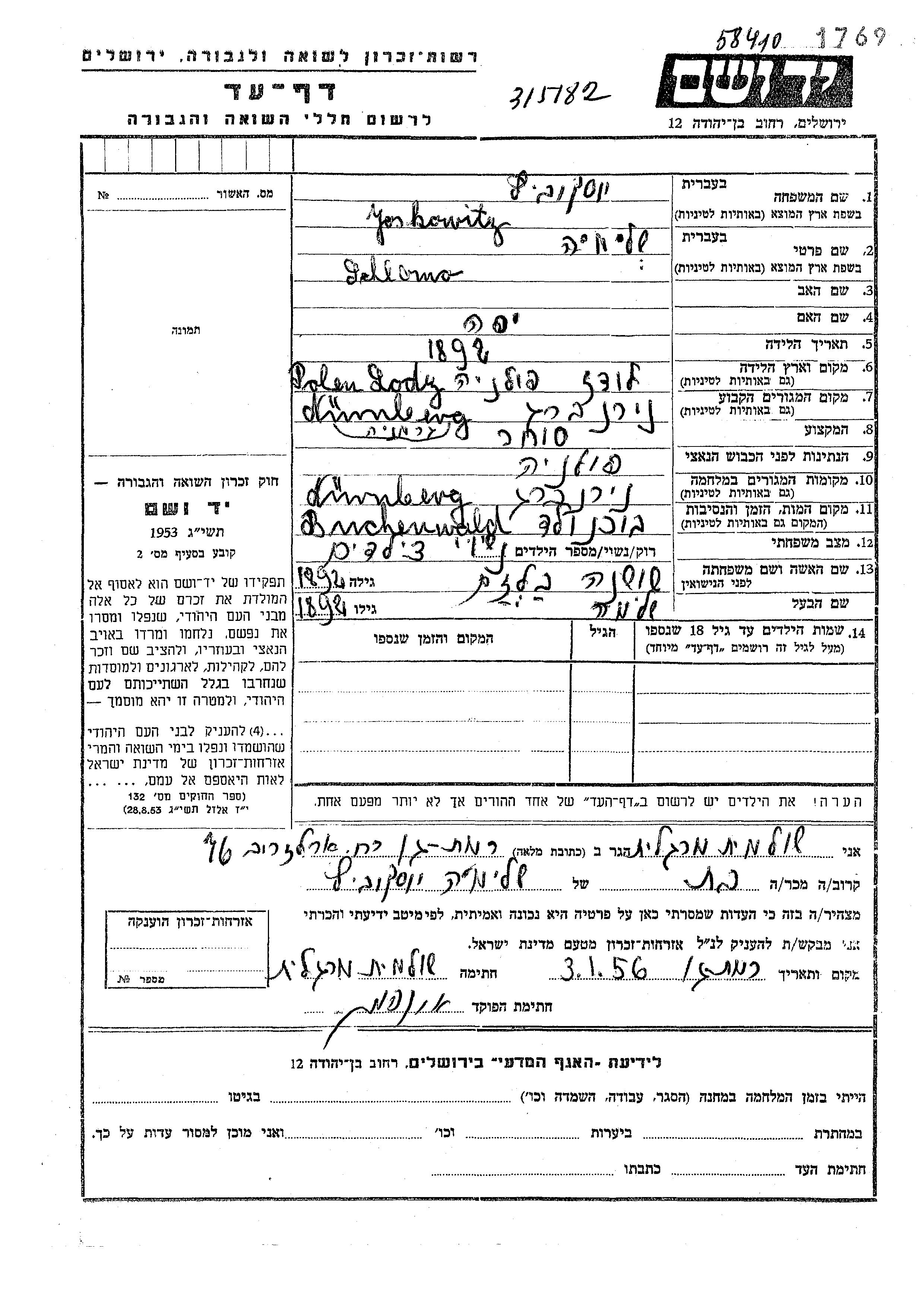 Йосковиц Шломо 1892 Нюрнберг, Германия Лист свидетельских показаний