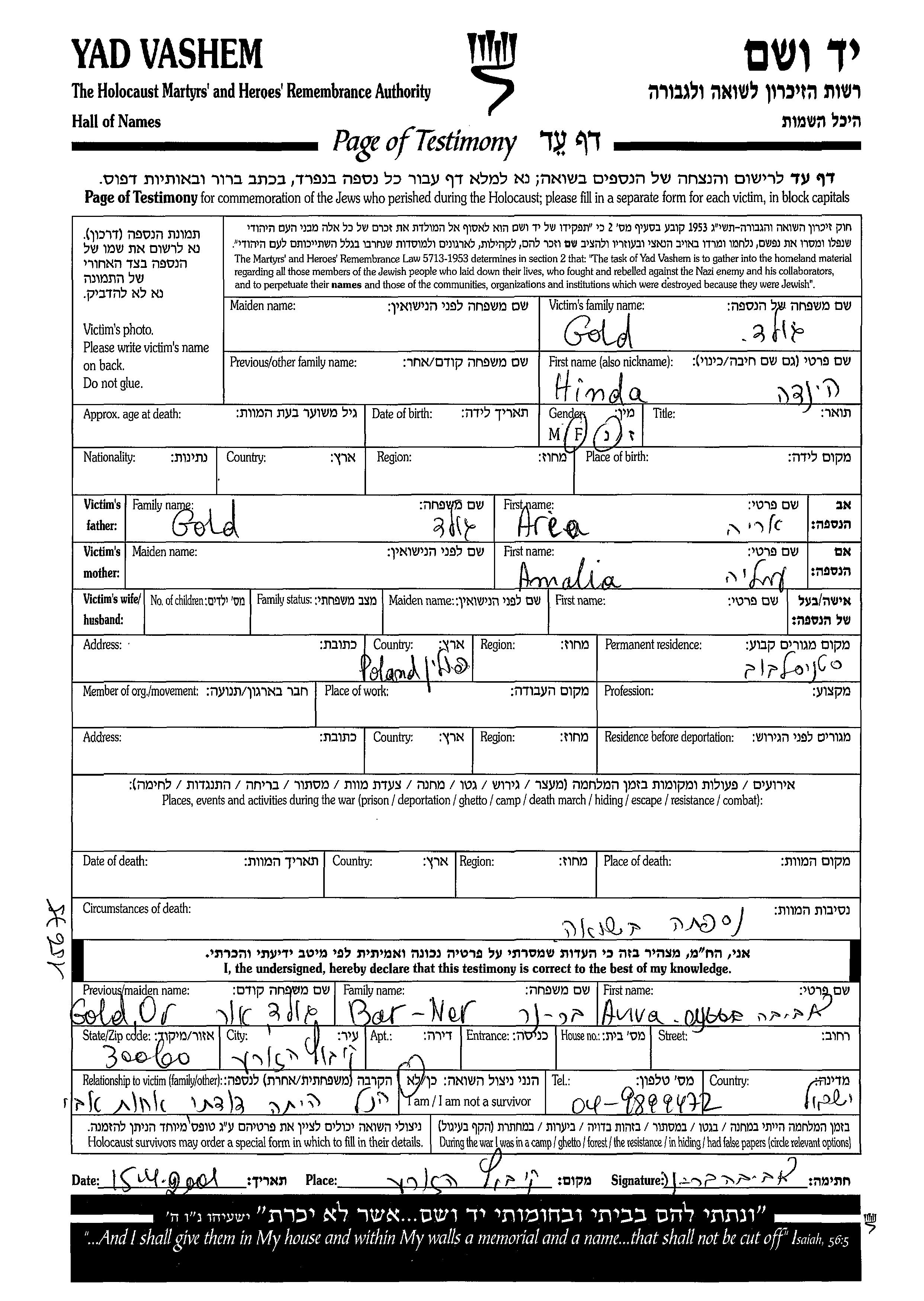 Хинда Гольд Ареа Амалия. Место жительства до войны: Станиславув, Польша.