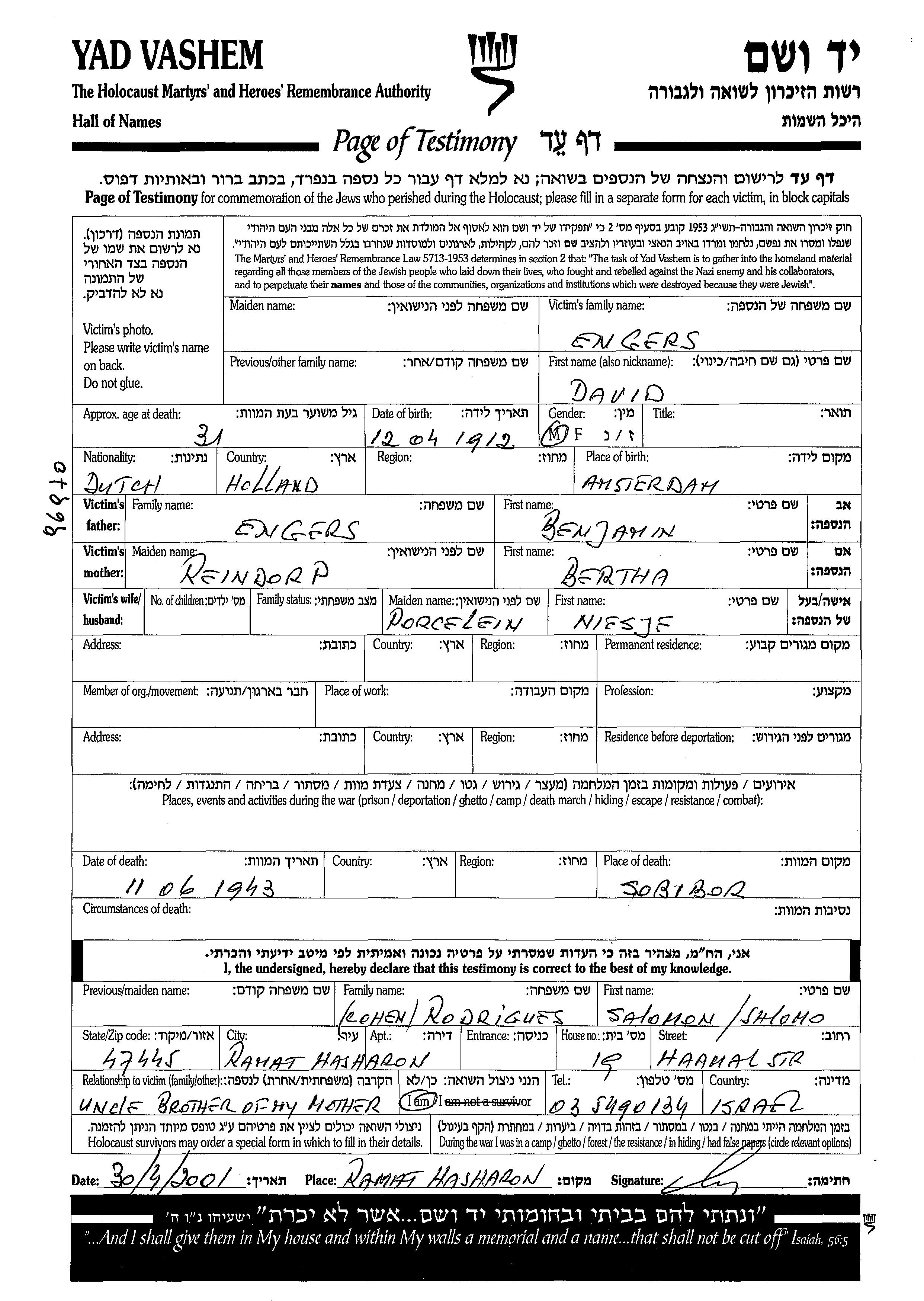 Давид Энгерс, место рождения: Амстердам, Нидерланды. Отец: Беньямин, mать:Берта. Женат / замужем.