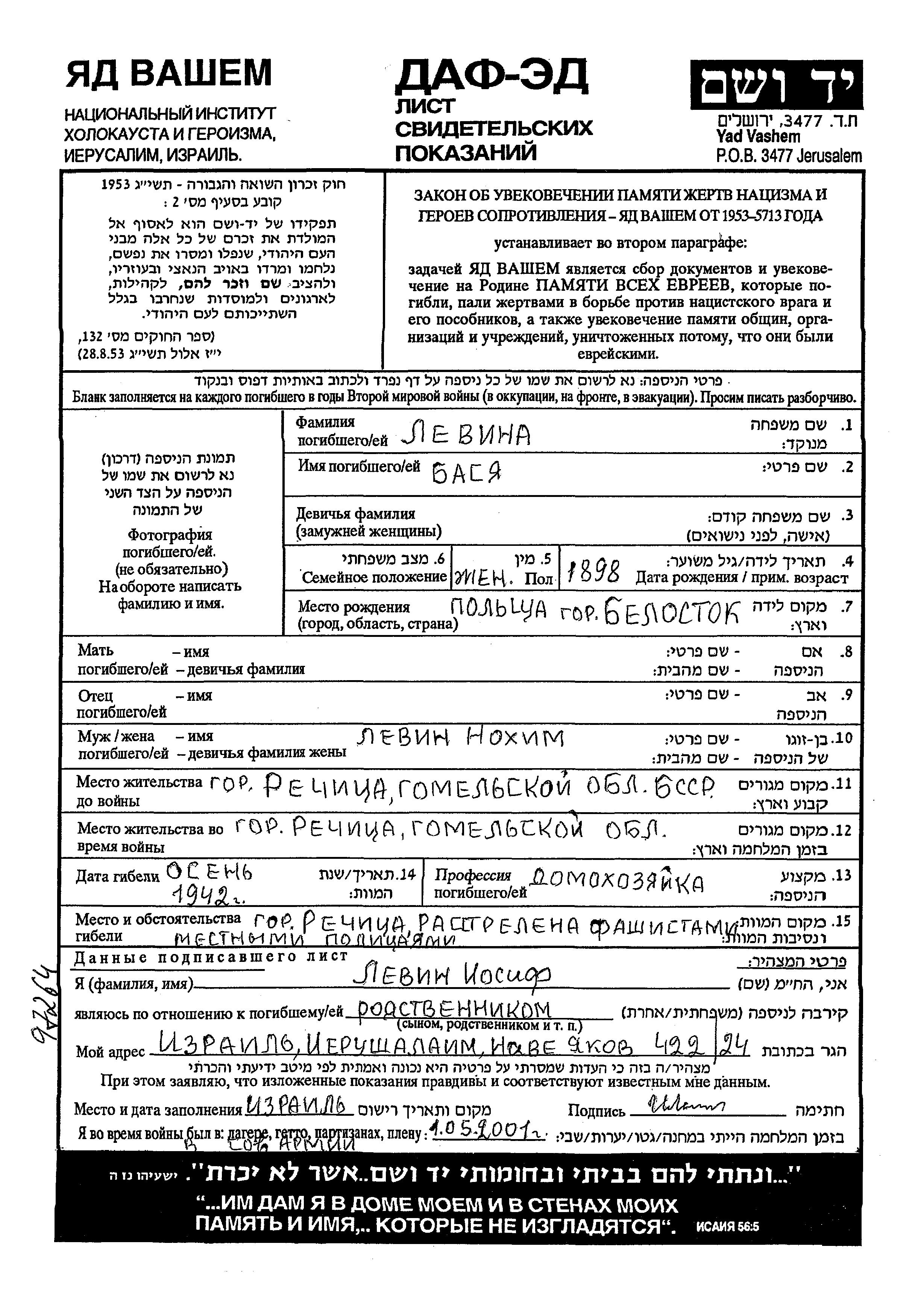 Левина Бася 1898 Речица, Белоруссия (СССР) Лист свидетельских показаний
