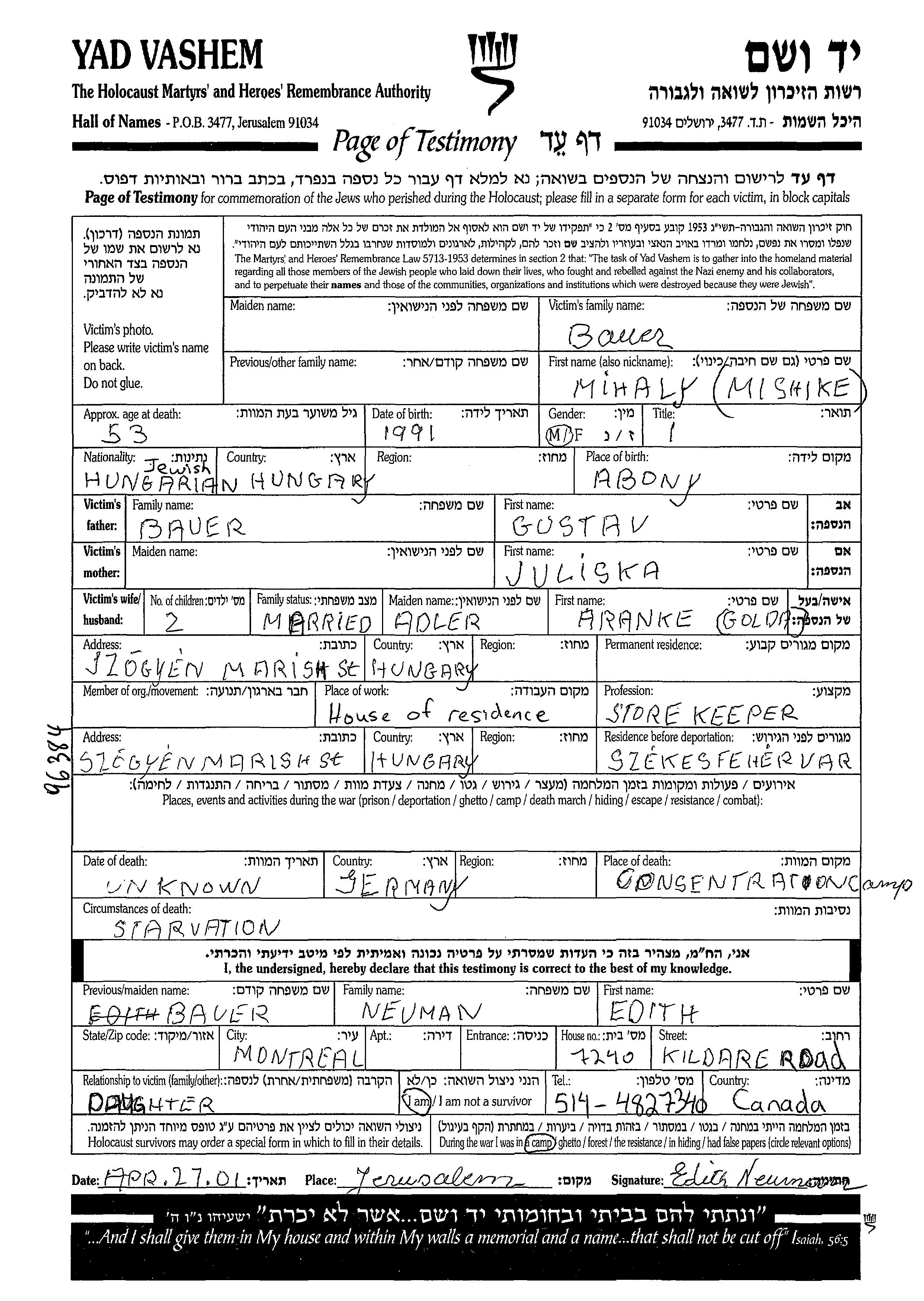 Михай Mishike Бауэр, место рождения: Абонь, Венгрия. Отец: Густав, mать:Юлишка. Владелец / владелица магазина. Женат / замужем. Место жительства до войны: Секешфехервар, Венгрия. Место во время войны: Секешфехервар, Венгрия.
