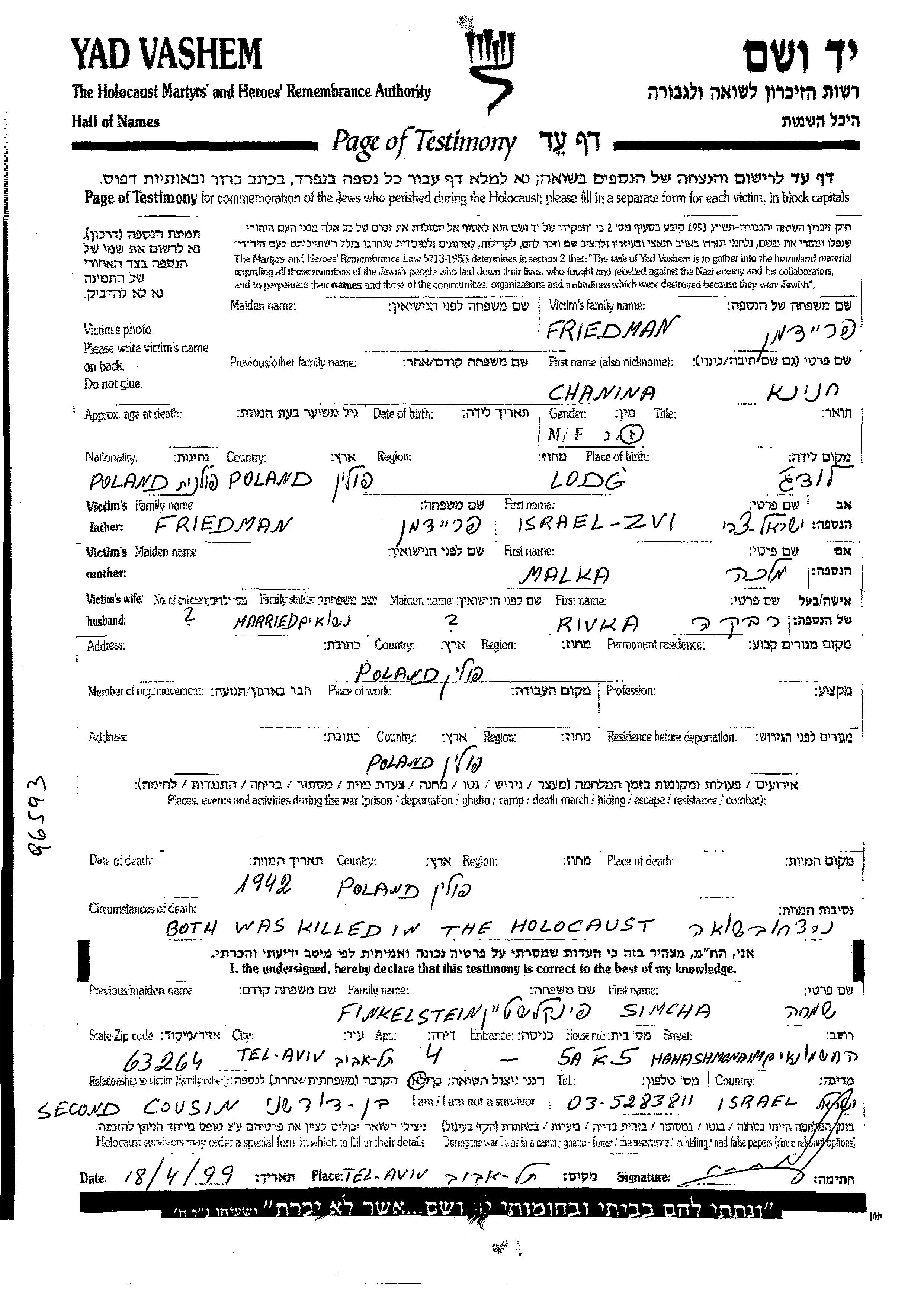 Ханина Фридман Фрейдман, место рождения: Лодзь, Польша. Отец: Исраэль Цви, mать:Малка. Женат / замужем. Место жительства до войны: Польша. Место во время войны: Польша.