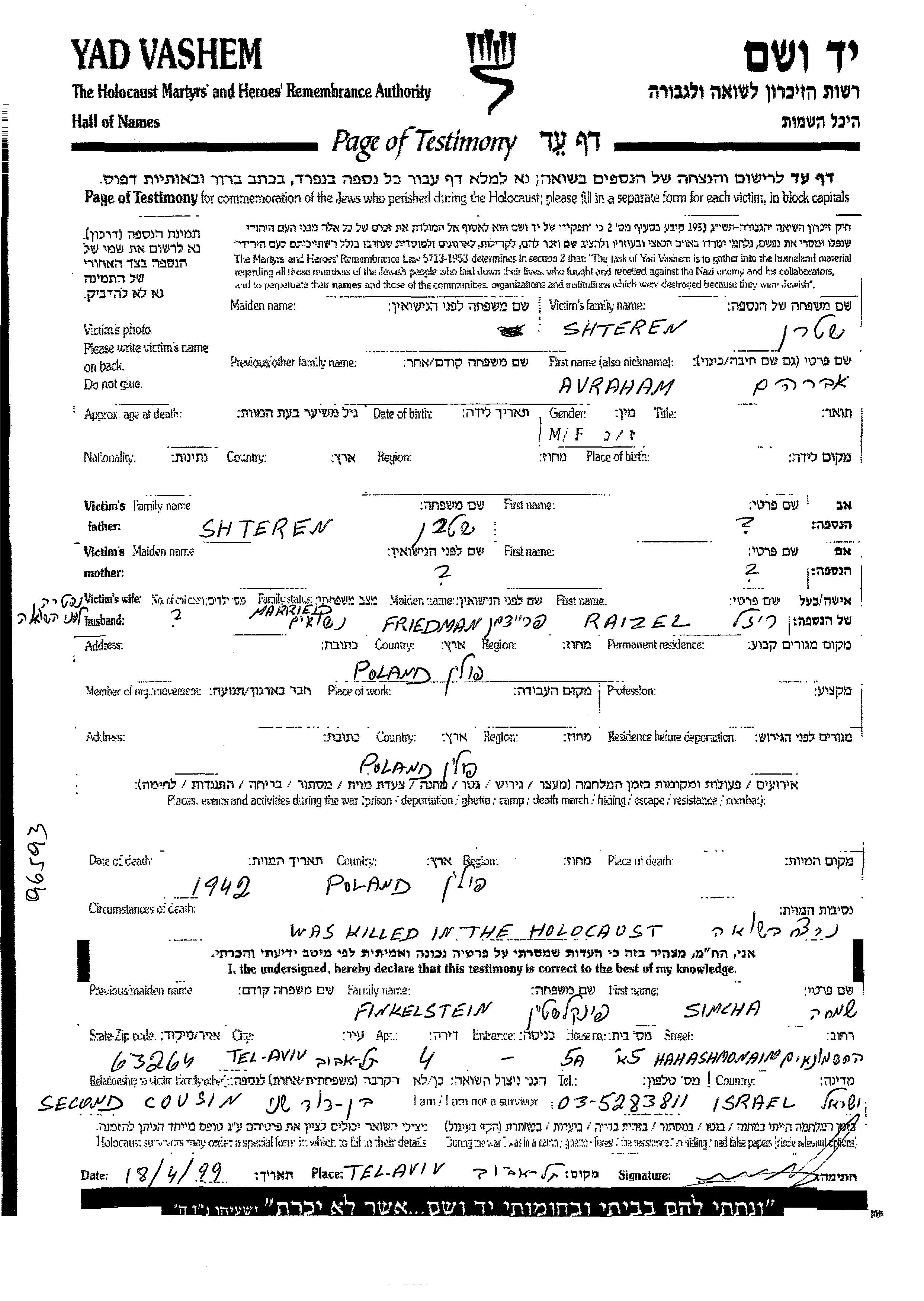 Авраам Штерен. Женат / замужем. Место жительства до войны: Польша. Место во время войны: Польша.