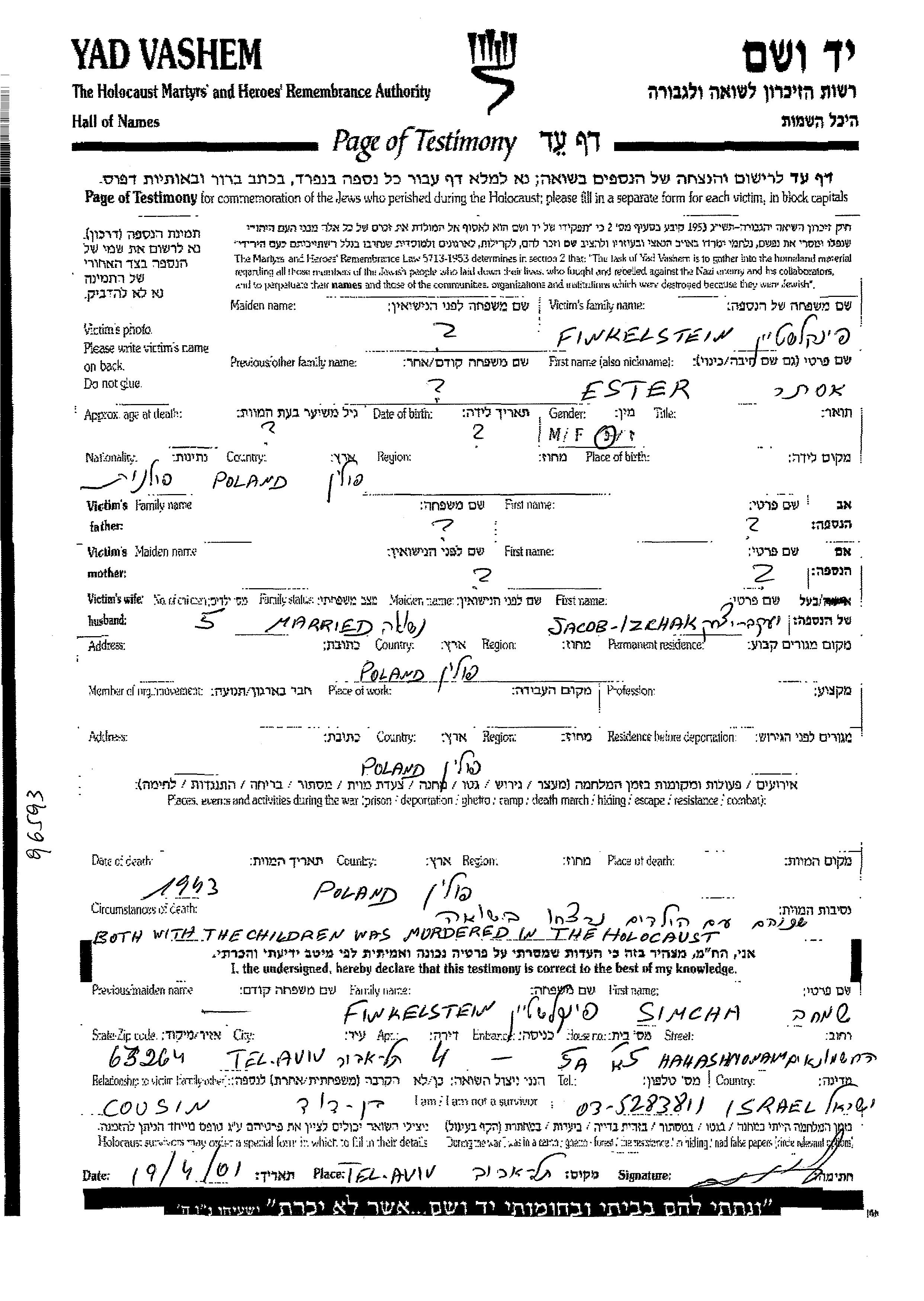 Финкельштайн Эстер Польша Лист свидетельских показаний