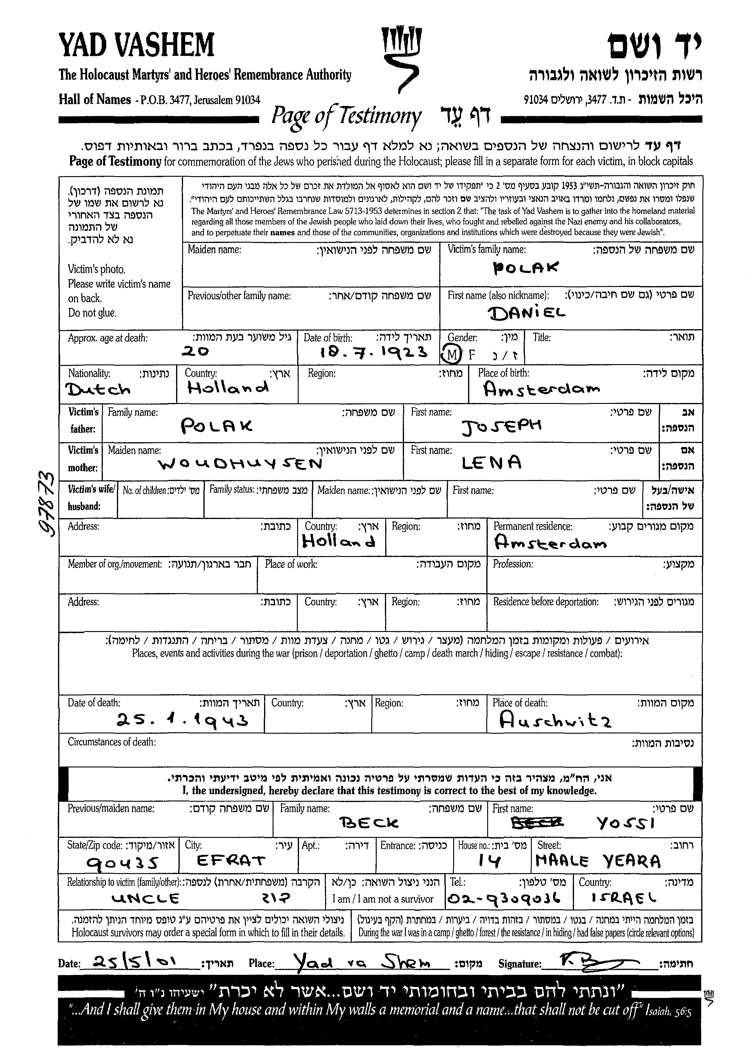 Даниэль Поляк, место рождения: Амстердам, Нидерланды. Отец: Йосеф, mать:Лена. Холост / не замужем. Место жительства до войны: Амстердам, Нидерланды. Место во время войны: Амстердам, Нидерланды.