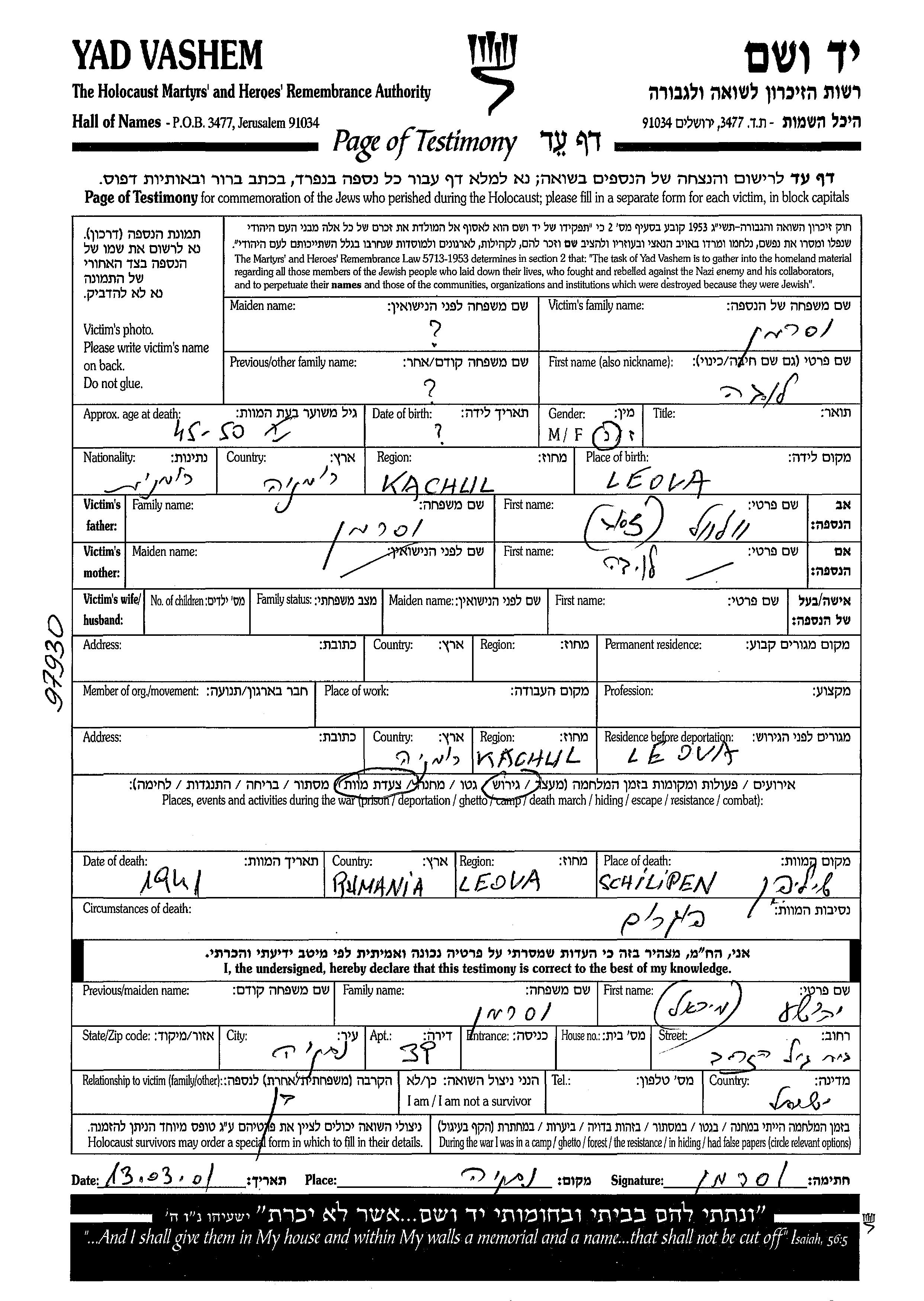 Яд Вашем - Листы свидетельских показаний Мемориального фонда