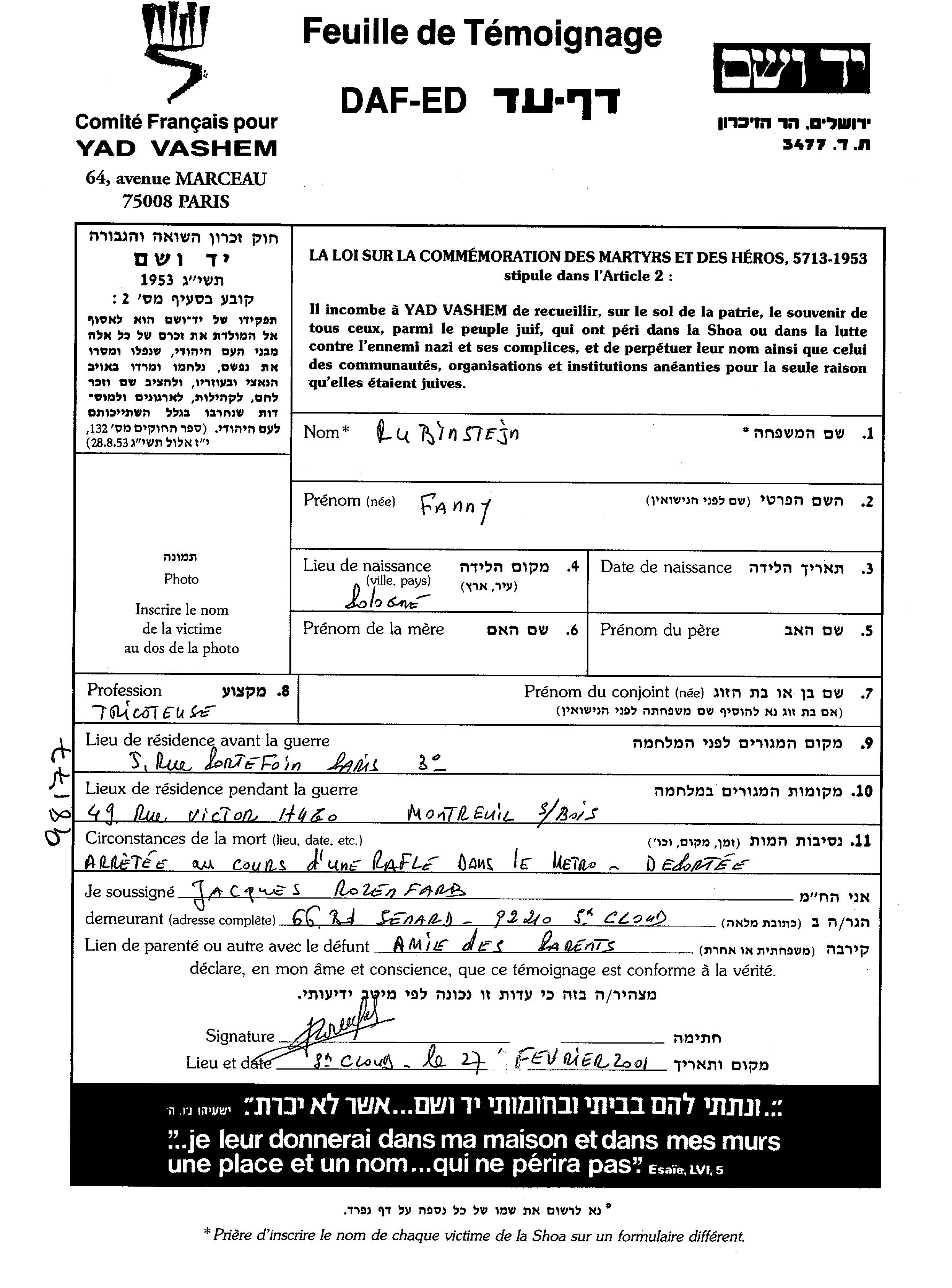 Рубинштейн Фанни Париж, Франция Лист свидетельских показаний