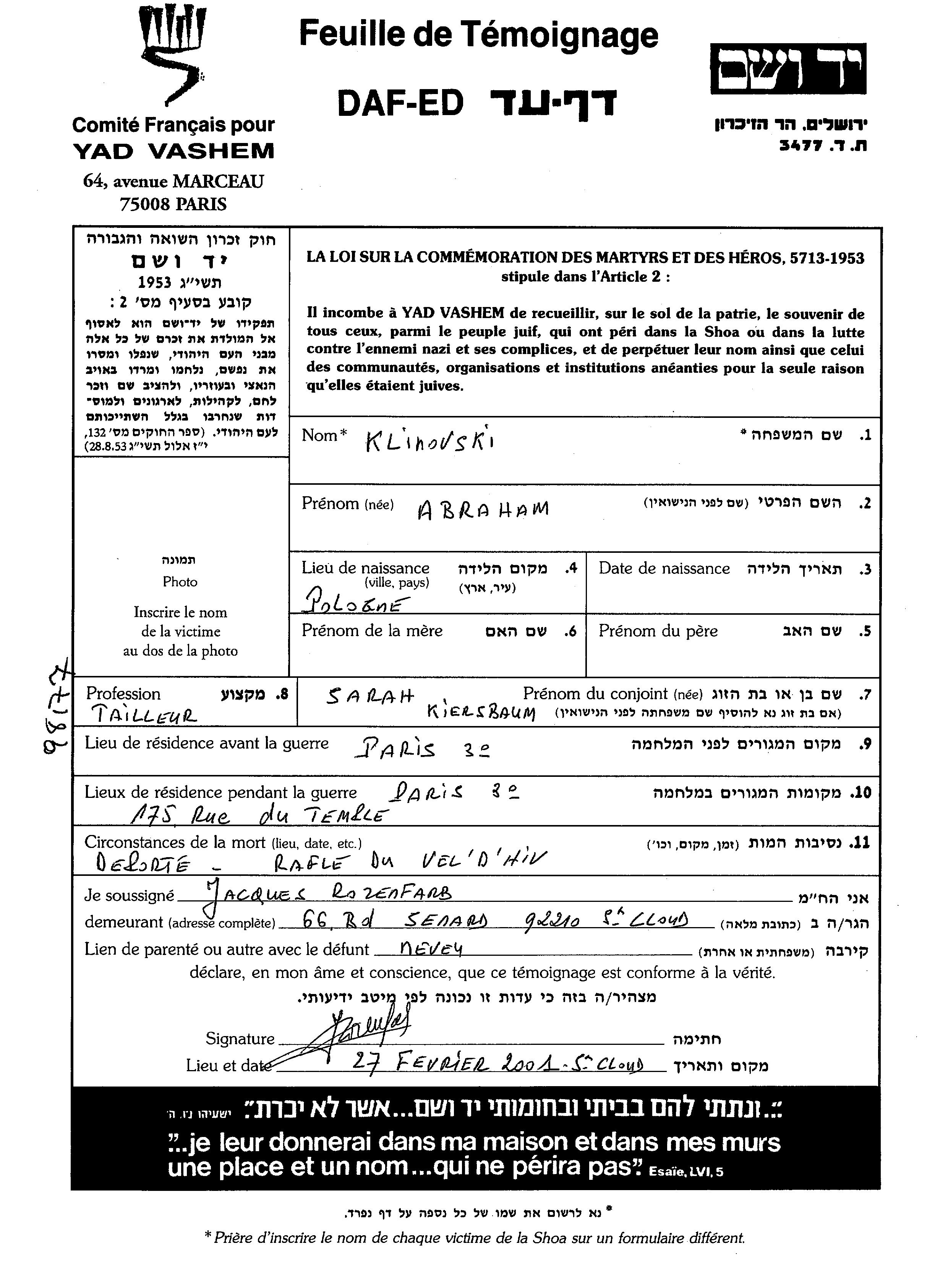 Клиновски Калиновски Абраам Париж, Франция Лист свидетельских показаний