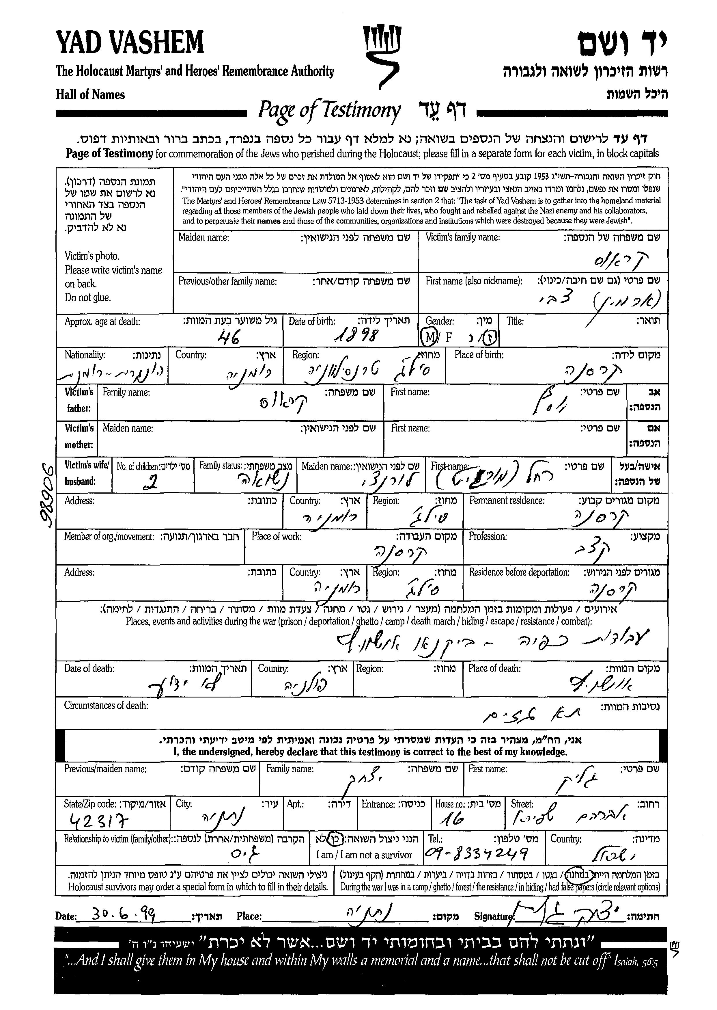 Краус Цви Армин 1898 Красна, Румыния Лист свидетельских показаний