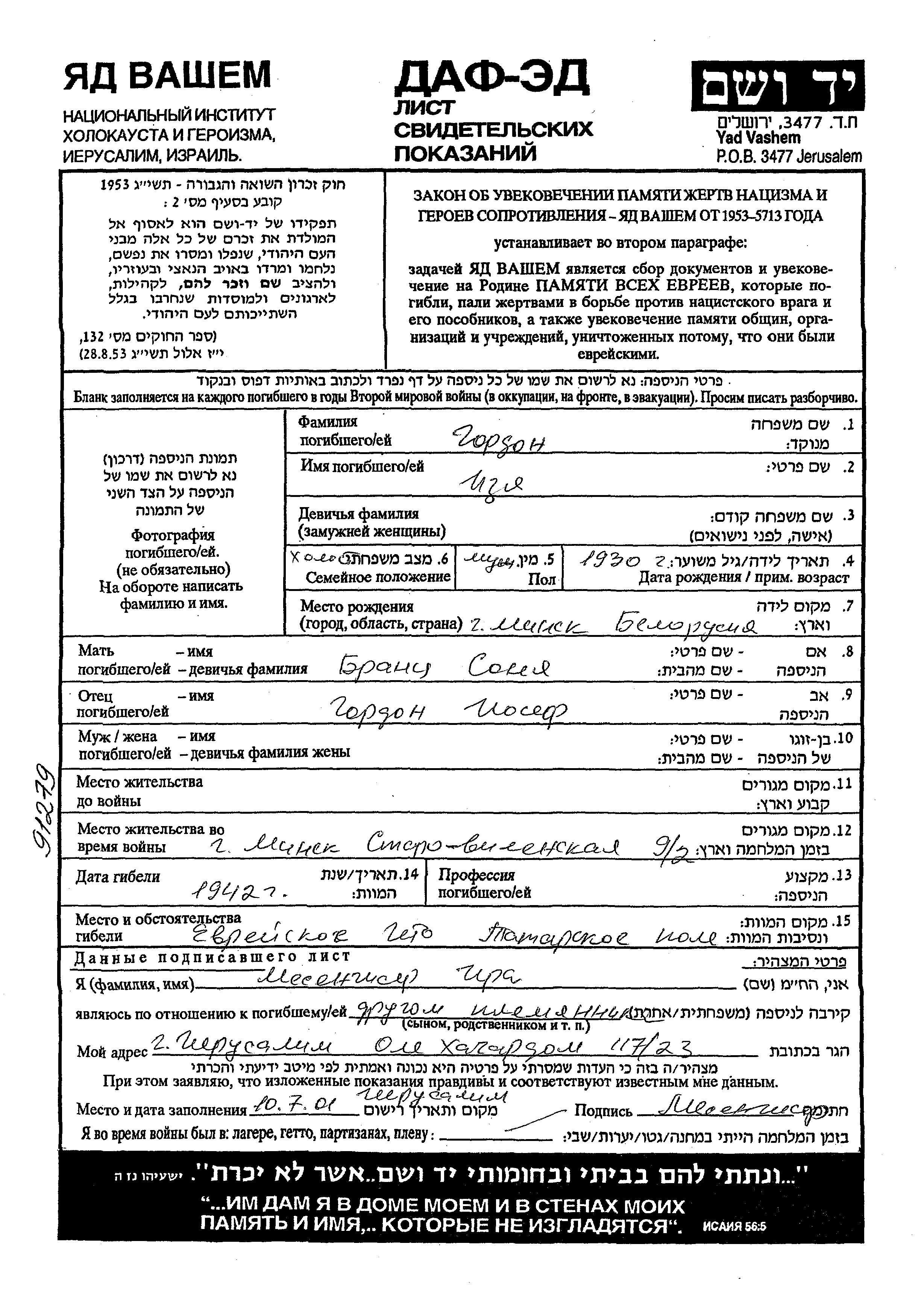 Гордон Изя 1930 место не указано, Лист свидетельских показаний