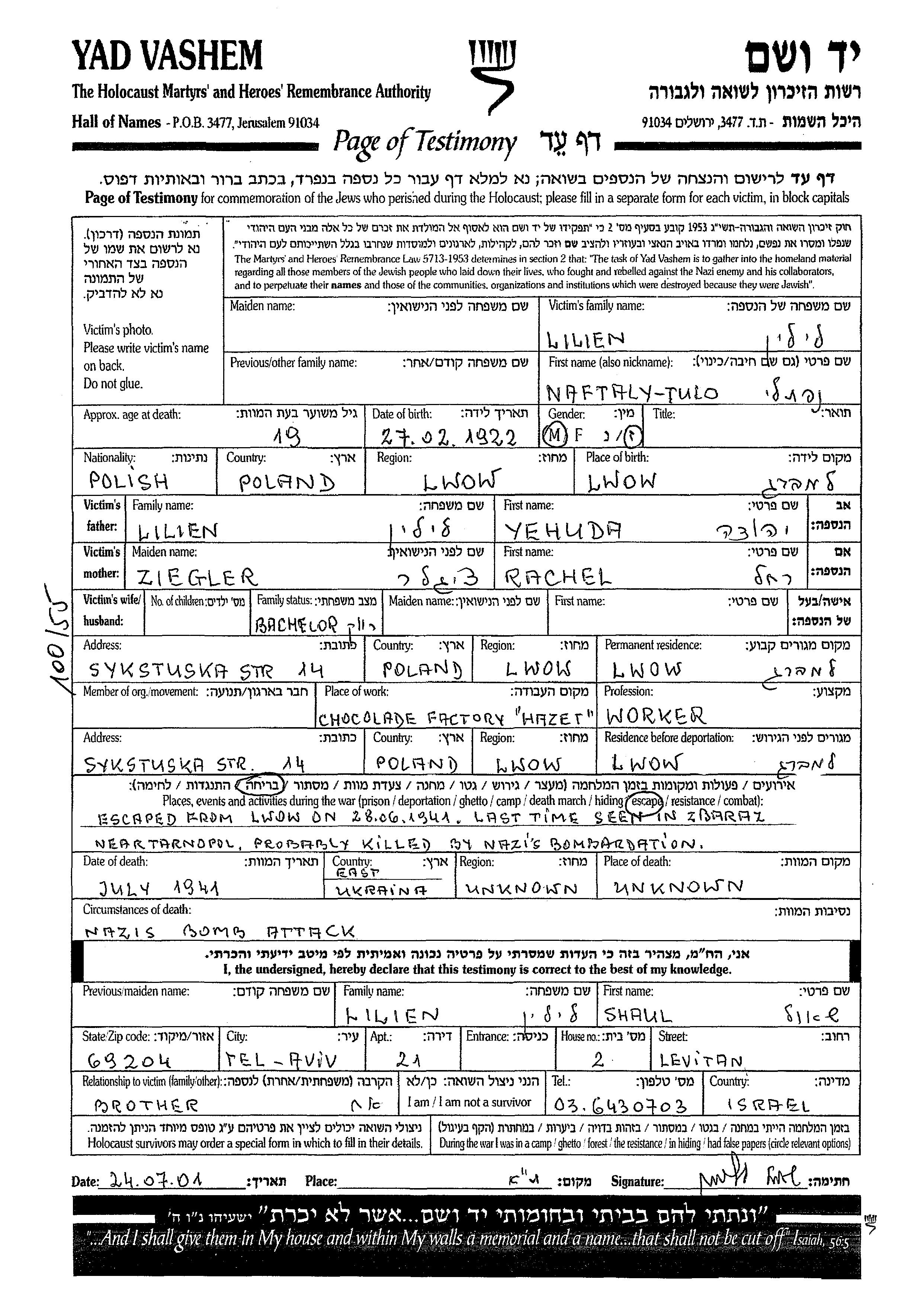 Туло Лилен, место рождения: Львов, Польша. Отец: Иегуда, mать:Рахель. Рабочий / рабочая. Холост / не замужем. Место жительства до войны: Львов, Польша. Место во время войны: Львов, Польша.