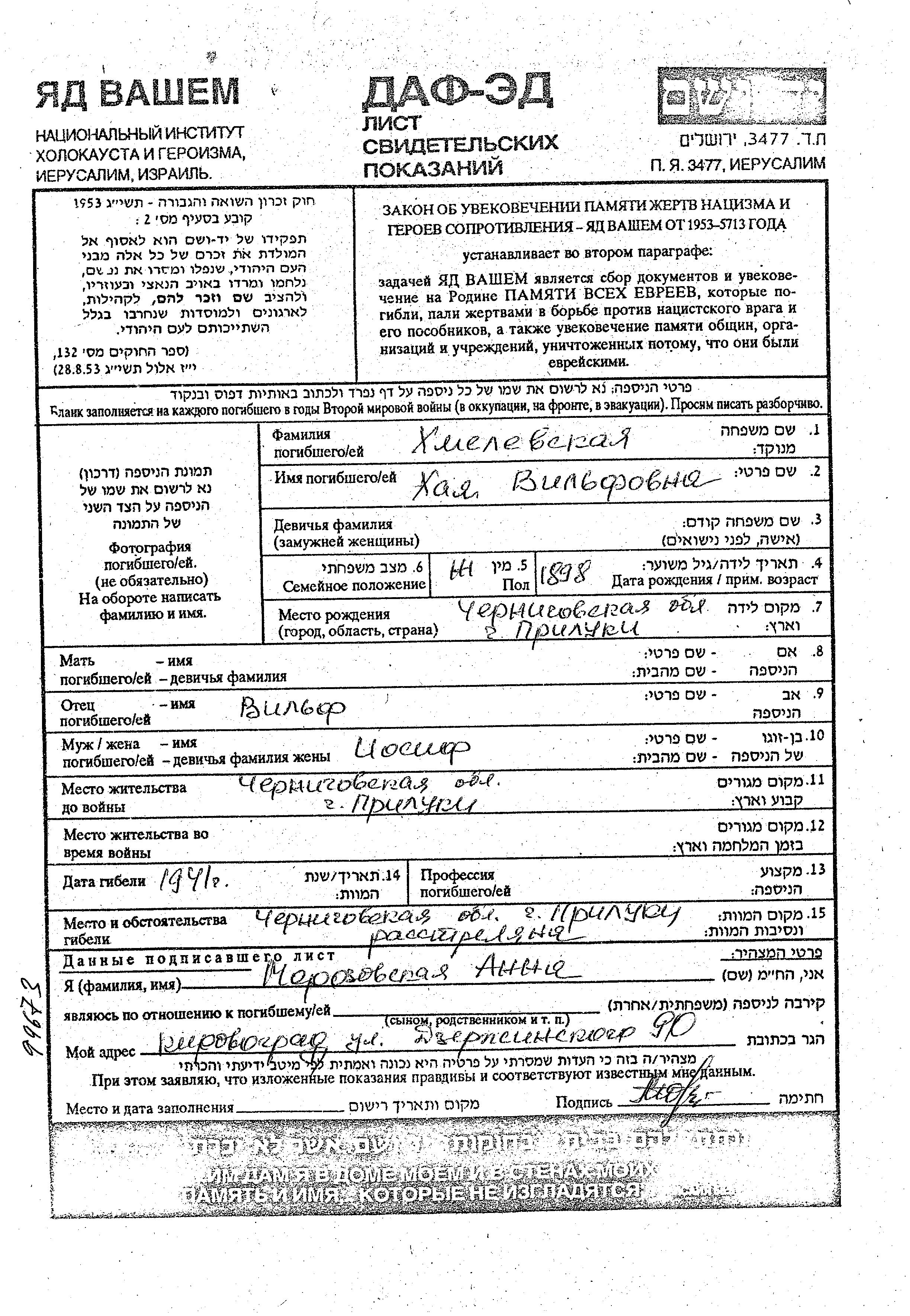 Хмелевская Хая 1898 Прилуки, Украина (СССР) Лист свидетельских показаний