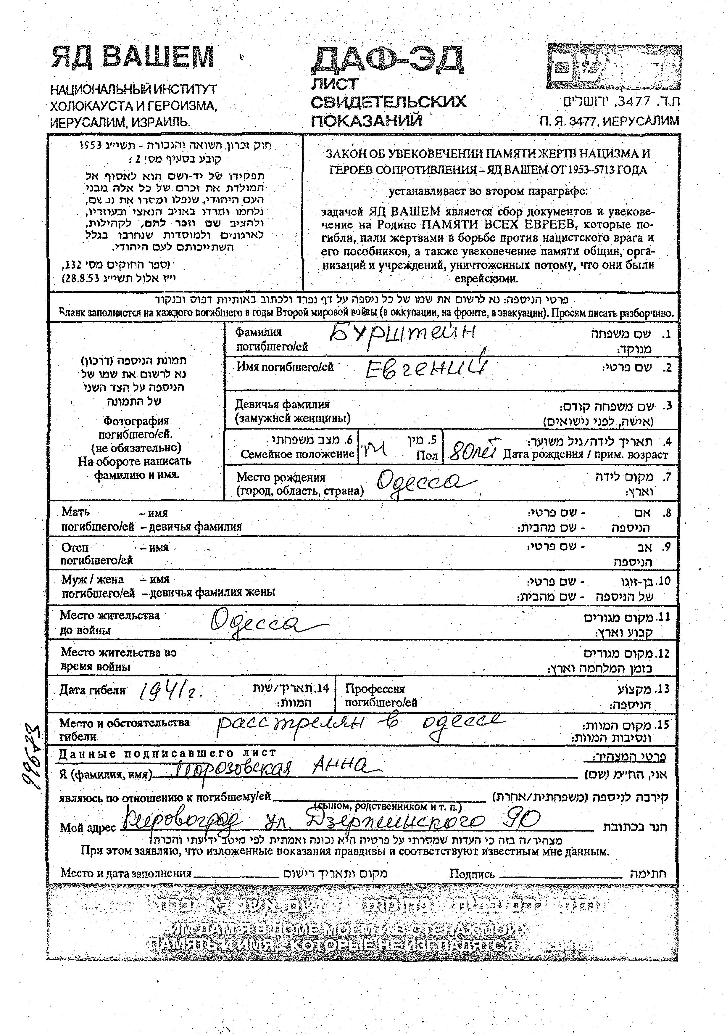 Бурштейн Евгений Одесса, Украина (СССР) Лист свидетельских показаний