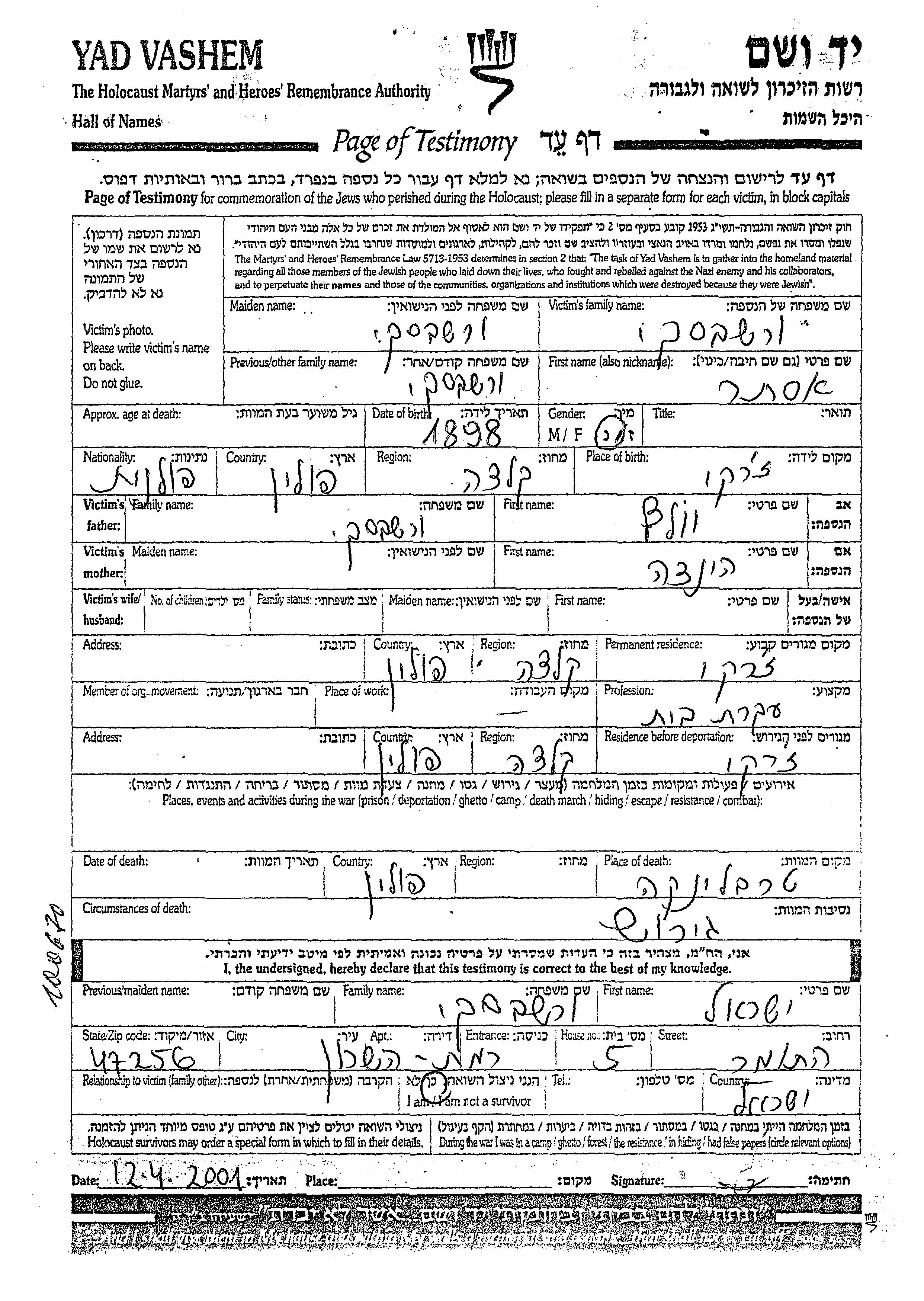 Варшавски Эстер 1898 Жарки, Польша Лист свидетельских показаний