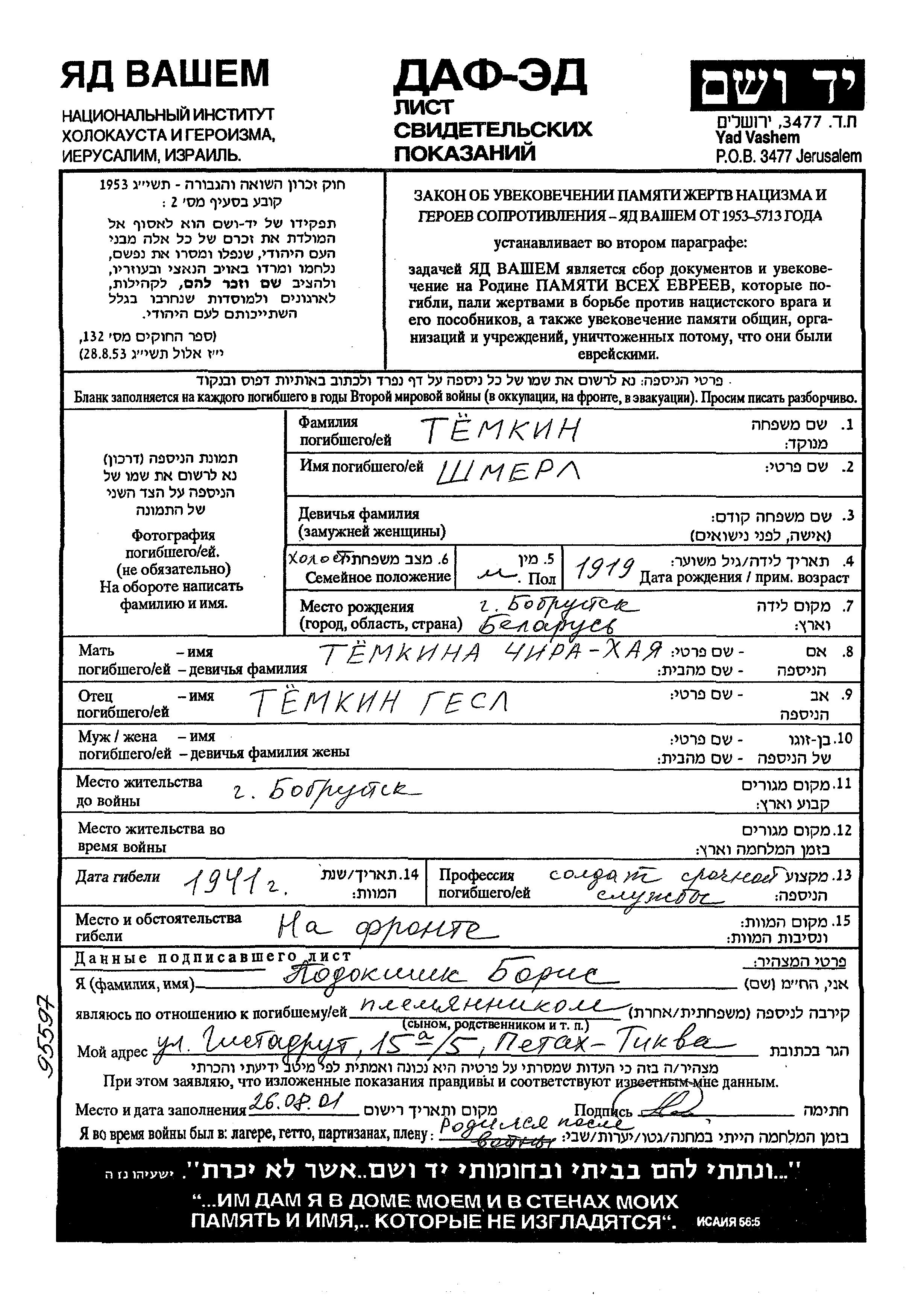 Шмерл Тёмкин, место рождения: Бобруйск, Белоруссия (СССР). Отец: Гесль, mать:Чира Хая. Солдат. Холост / не замужем. Место жительства до войны: Бобруйск, Белоруссия (СССР). Место во время войны: Вооруженные силы Советского Союза.