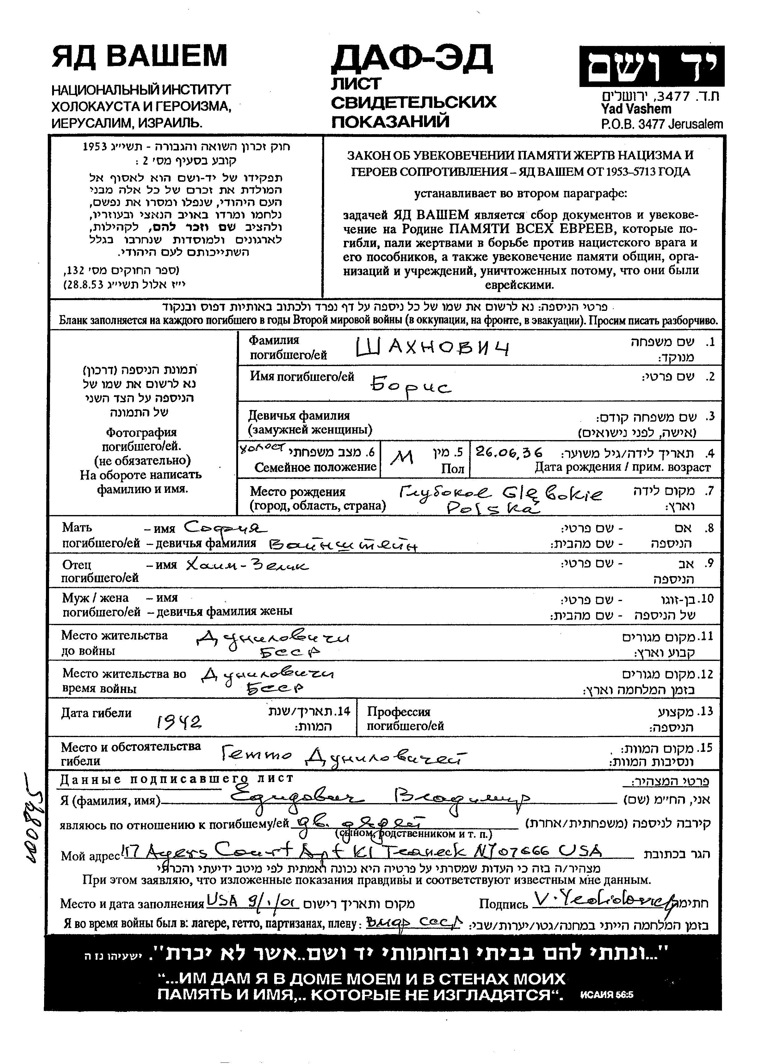 Шахнович Борис 1936 Дуниловичи, Польша Лист свидетельских показаний
