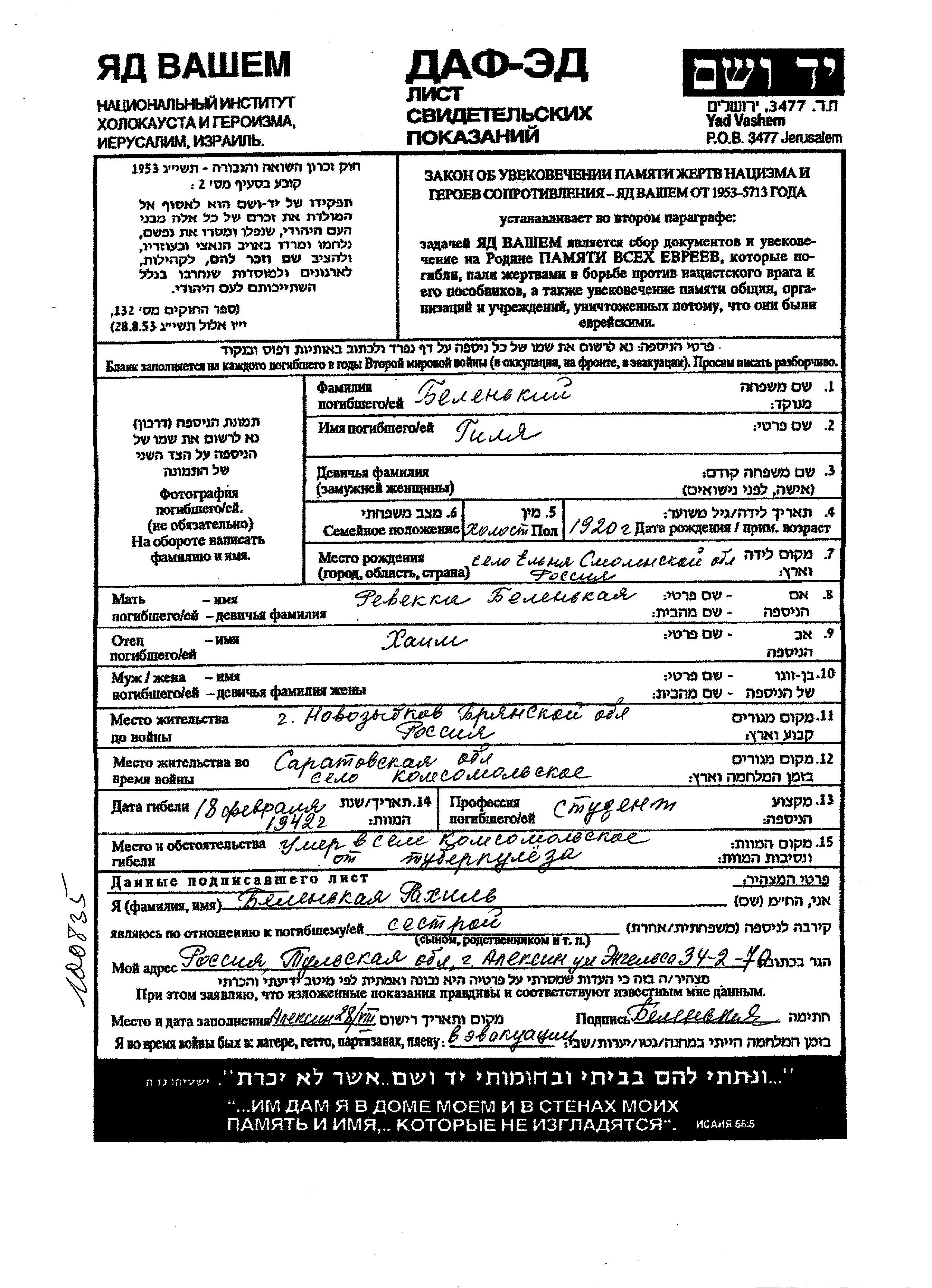 Яд Вашем - Листы свидетельских показаний Мемориального фонда